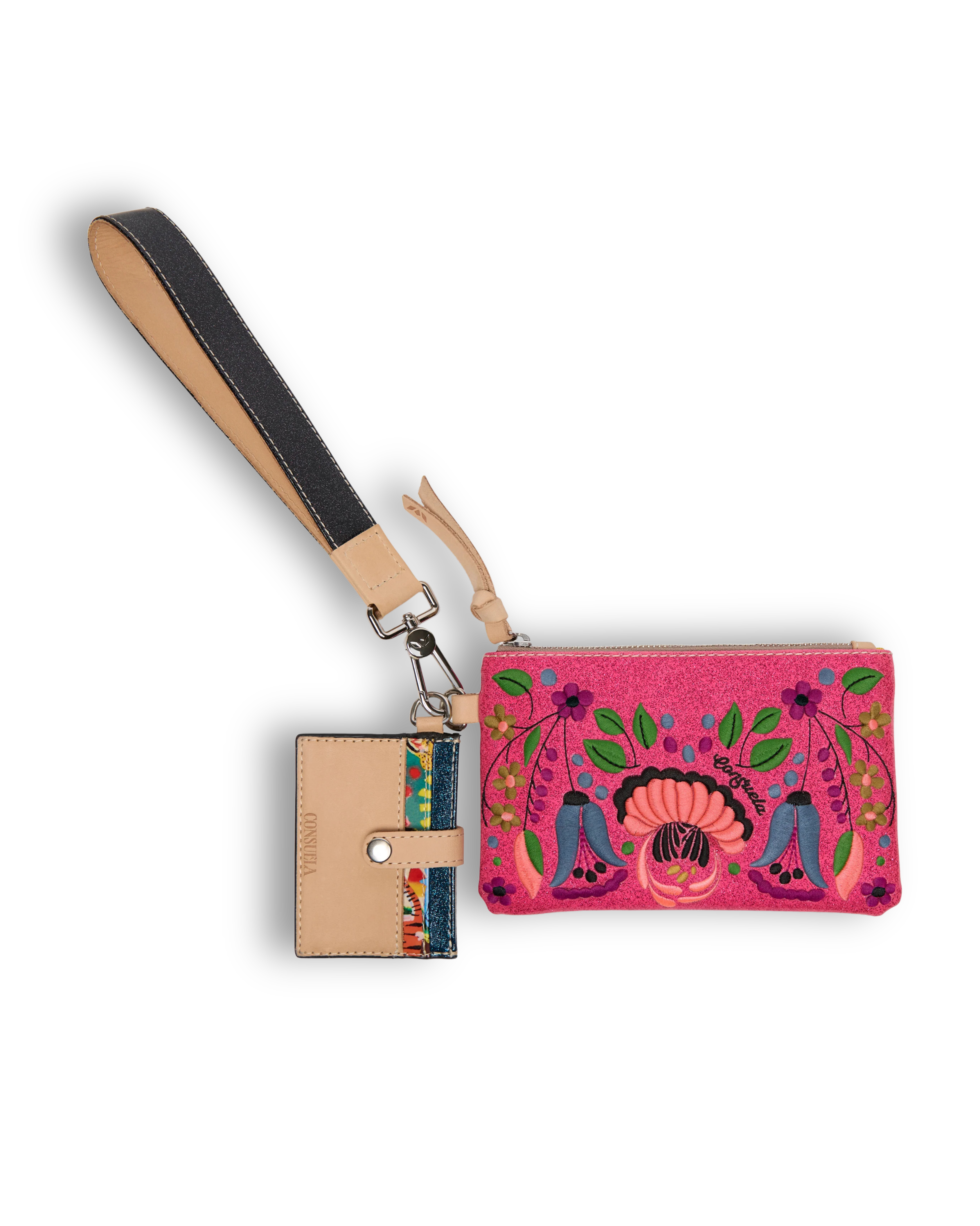 The Combi, a combination of on-the-go accessories, is a new way to carry your keys, cards, and the small stuff together or separately. This embroidered wristlet wallet includes a pocket pouch, secure card slot wallet and fits comfortably around your wrist.