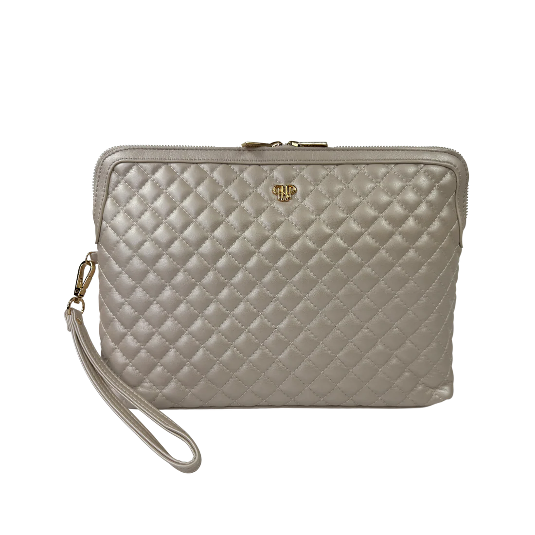 This large makeup case has with a detachable wristlet that makes it easy for this case to double as a chic clutch. Seamlessly transition from day to night, effortlessly carrying your keys, lipstick, and even a passport. The design includes a middle divider with a zipper closure that keeps your items securely in place, while the four interior pockets provide a dedicated space for your smaller essentials.