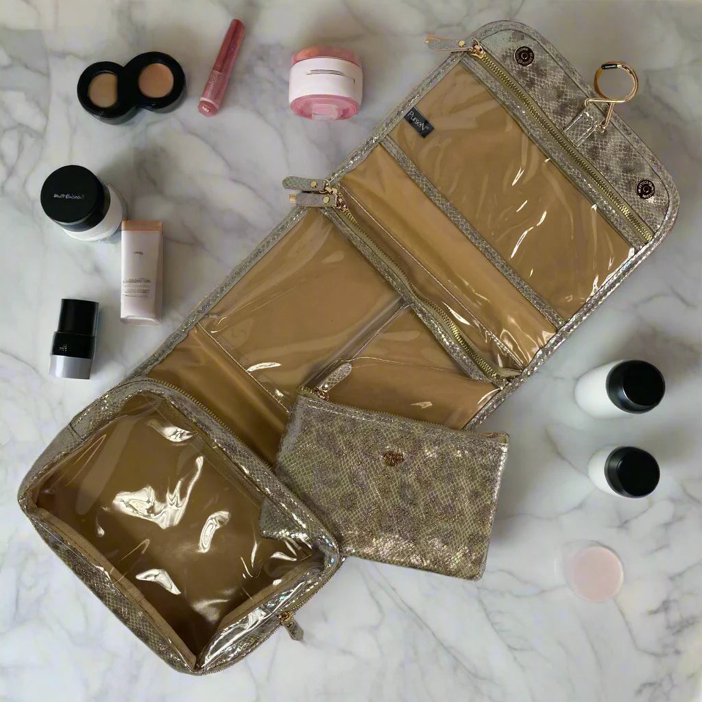 The Glimmer Leopard Getaway Toiletry Cas is perfect for travel and organization. Keep your toiletries organized and secure by packing them in our customer favorite classic toiletry case. The elegant folding design features 4 zippered pockets with a clear view design and a bottom pocket that includes a removable zipper pouch. The top folding hanger makes it easy to see and access your items no matter where you are.
