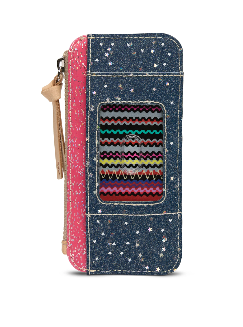 Keeping things light and easy, the card organizer is perfect for credit cards and folded bills. This colorful wallet’s snap-closure and zipper compartment provides security while you take on the day.