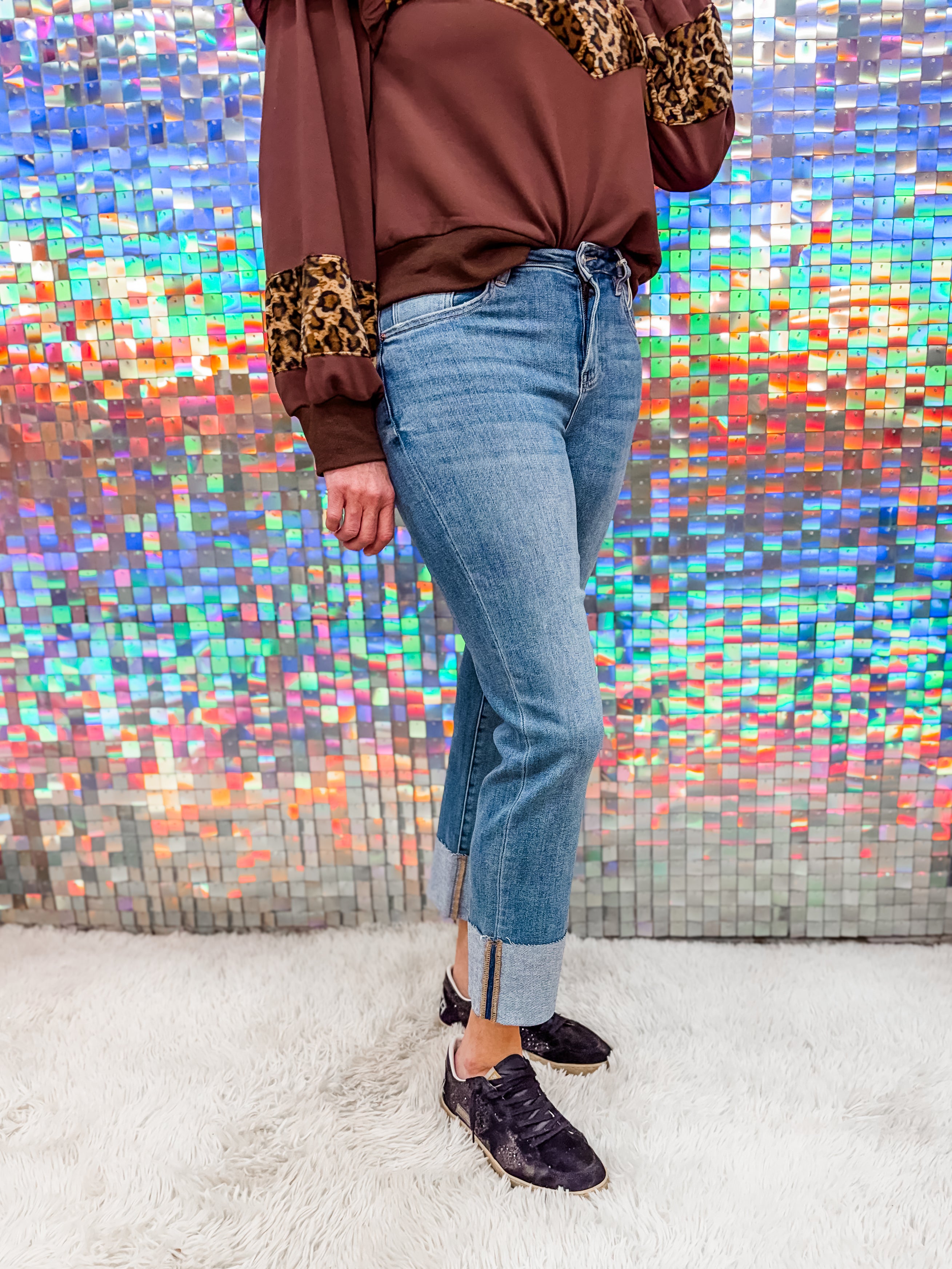 This comfort stretch high-rise jeans have a straight silhouette , cut from denim in a classic ‘Mid Blue' wash, with thick cuffs hem create a new-vintage look.