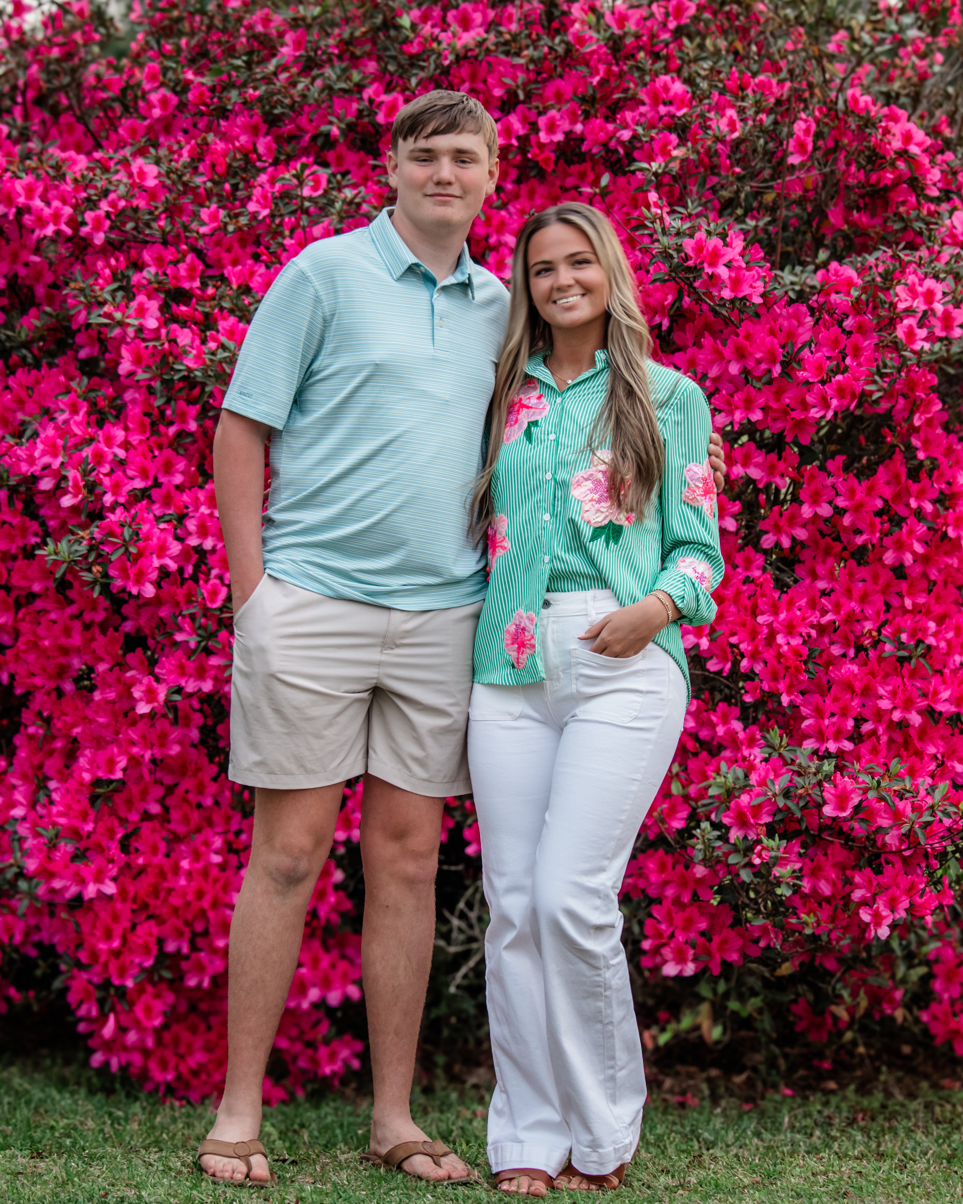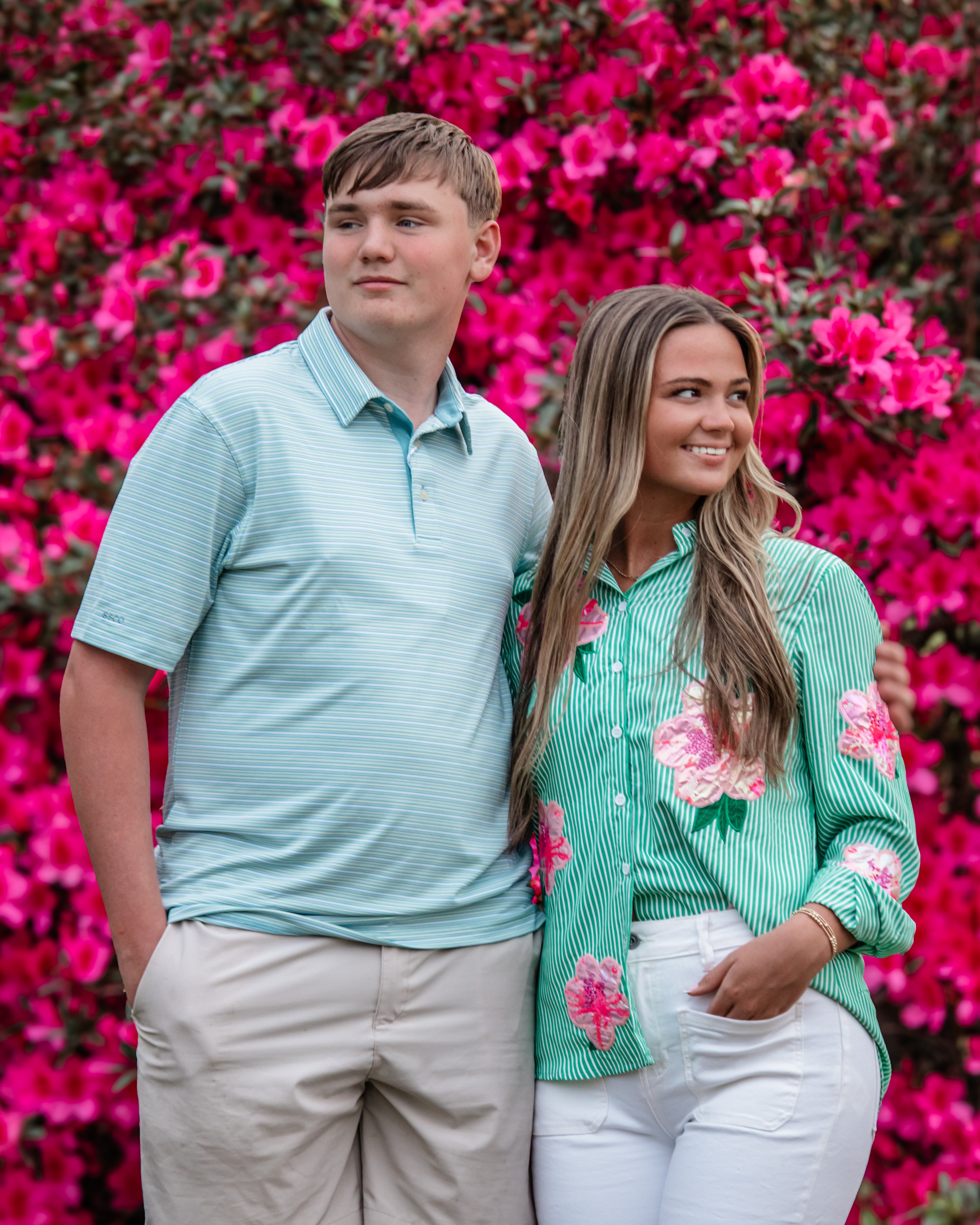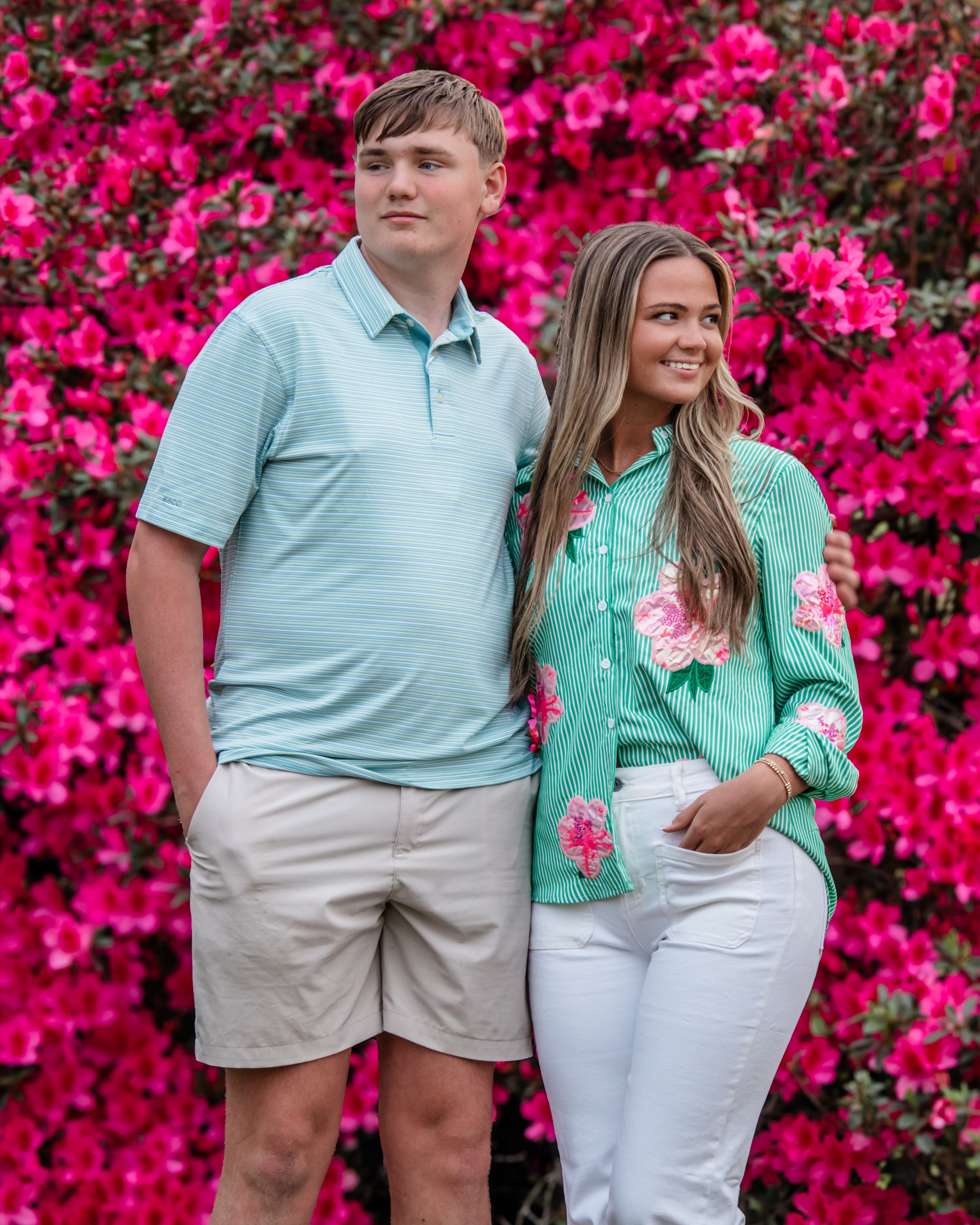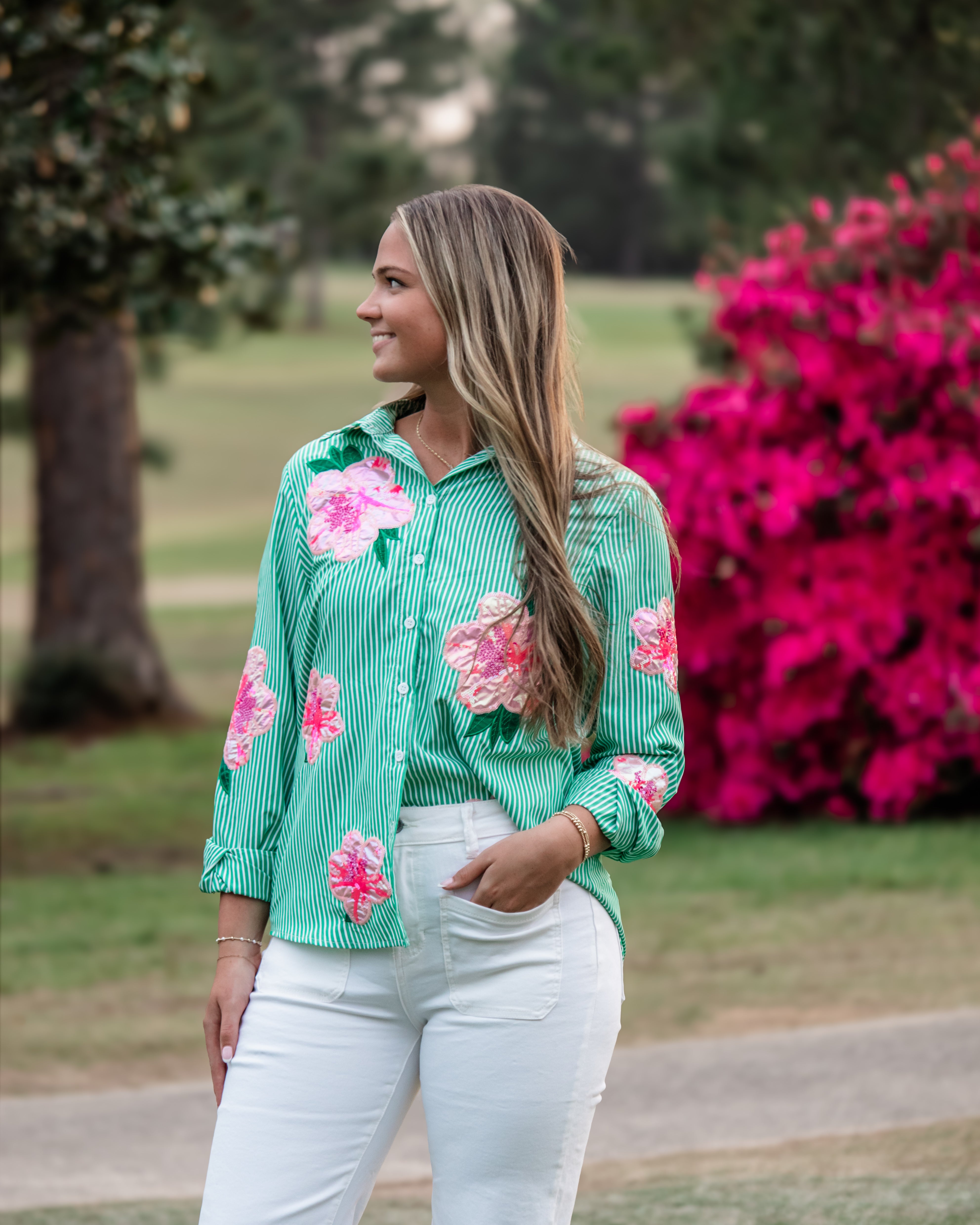 The Azalea Button Down Shirt features crisp green-and-white vertical stripes accented with standout pink azalea floral details, giving it that polished “country club chic” vibe. The classic button-down silhouette keeps it timeless while the oversized floral appliqués add a playful, statement-making touch.