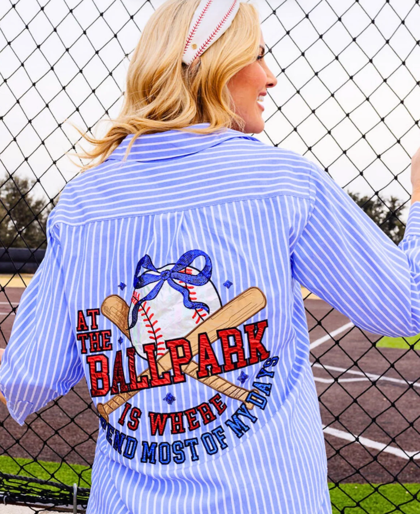 This blue-and-white pinstripe top gives a playful nod to America’s favorite pastime with baseball-inspired button details that add just the right amount of sporty charm. The front keeps things clean and polished, while the statement embroidery on the back brings the personality.