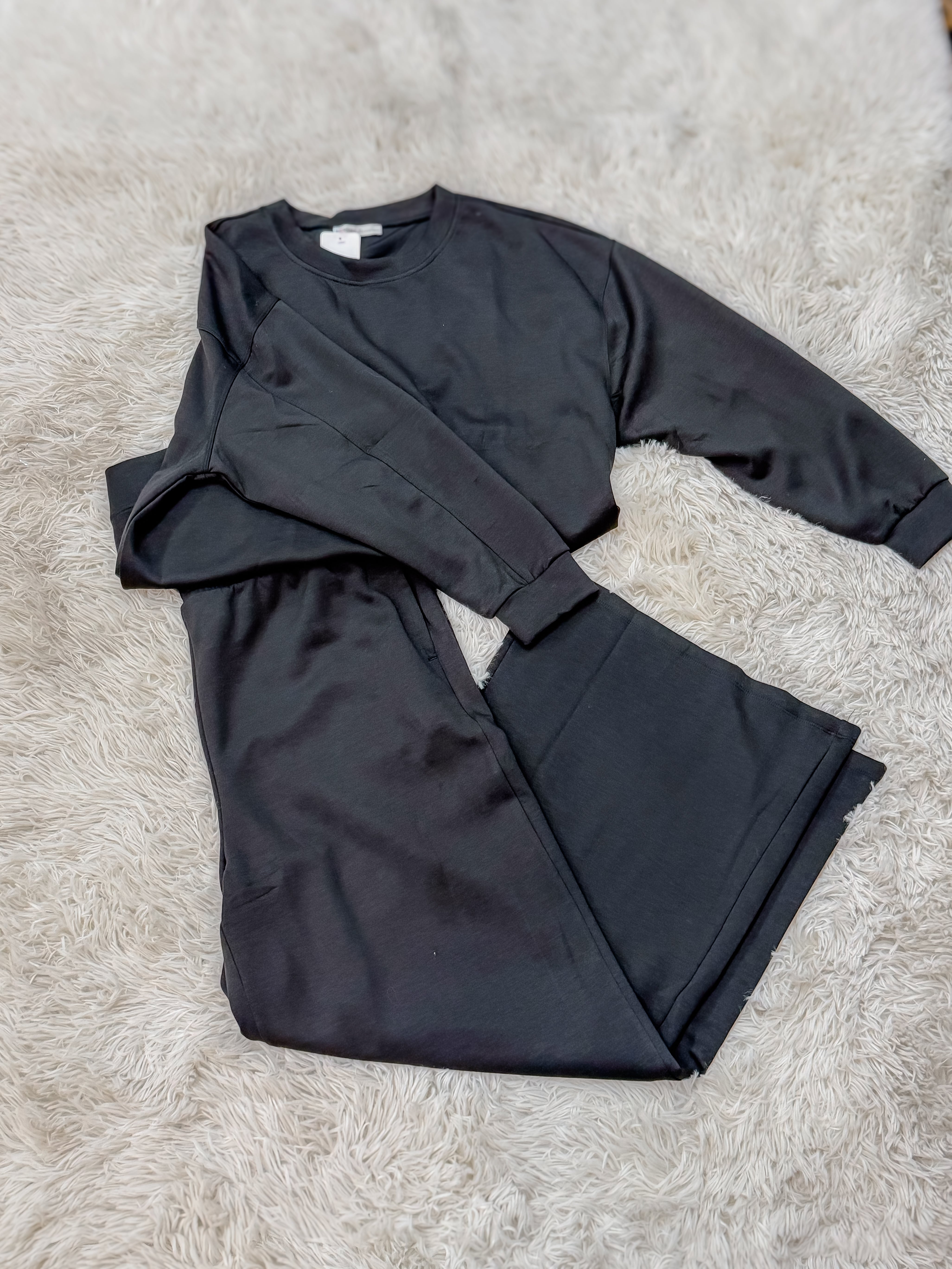 Plus scuba crewneck pullover and pants set in black or brown. Made from a luxe scuba fabric that’s soft, smooth, and structured for a flattering fit. The pullover features a relaxed crew neckline and drop shoulders for that effortless, elevated look, while the matching pants offer a comfortable elastic waistband and straight-leg silhouette. Perfect for travel days, errands, or dressed-up lounging—this chic matching set keeps you cozy and confident all season long.