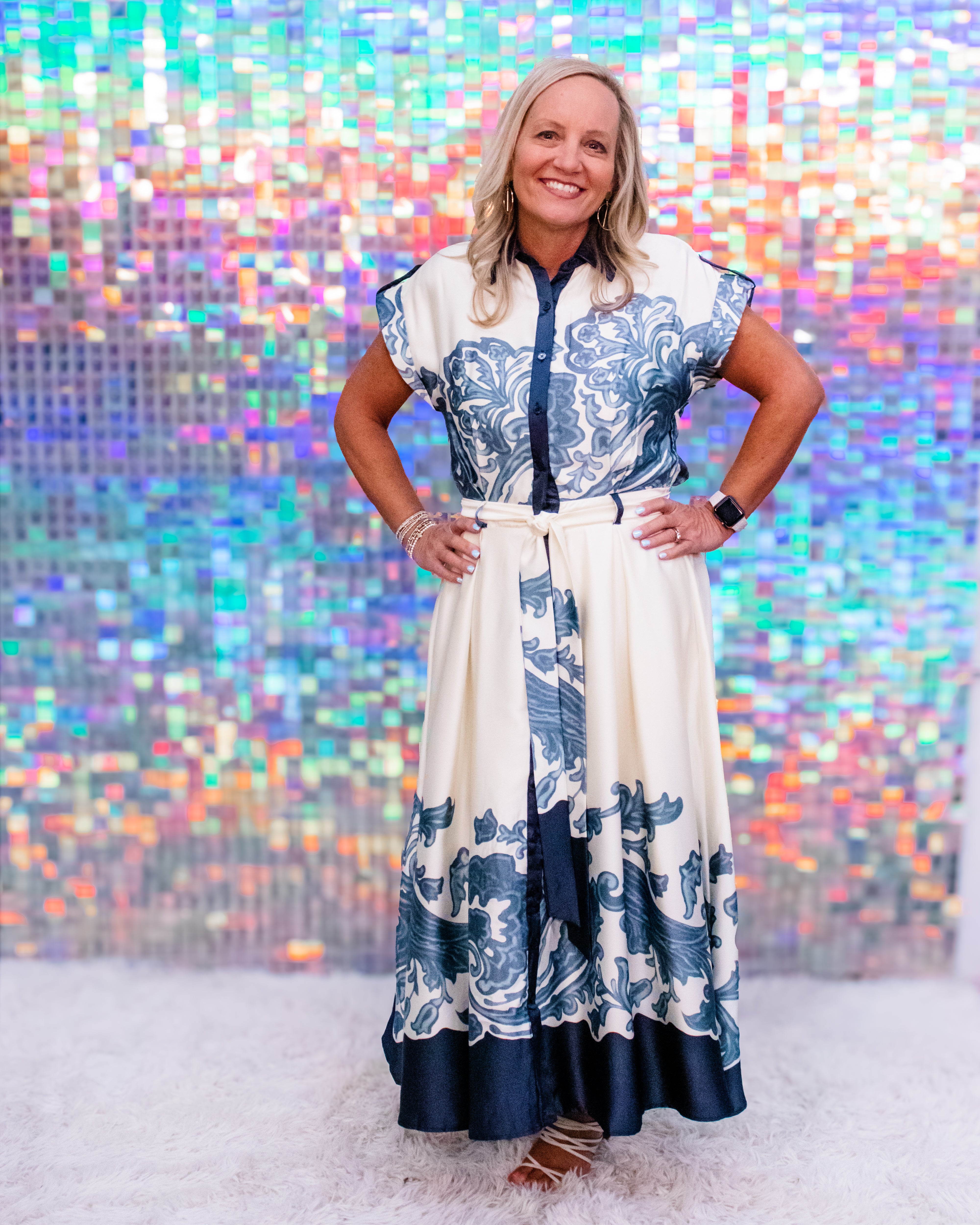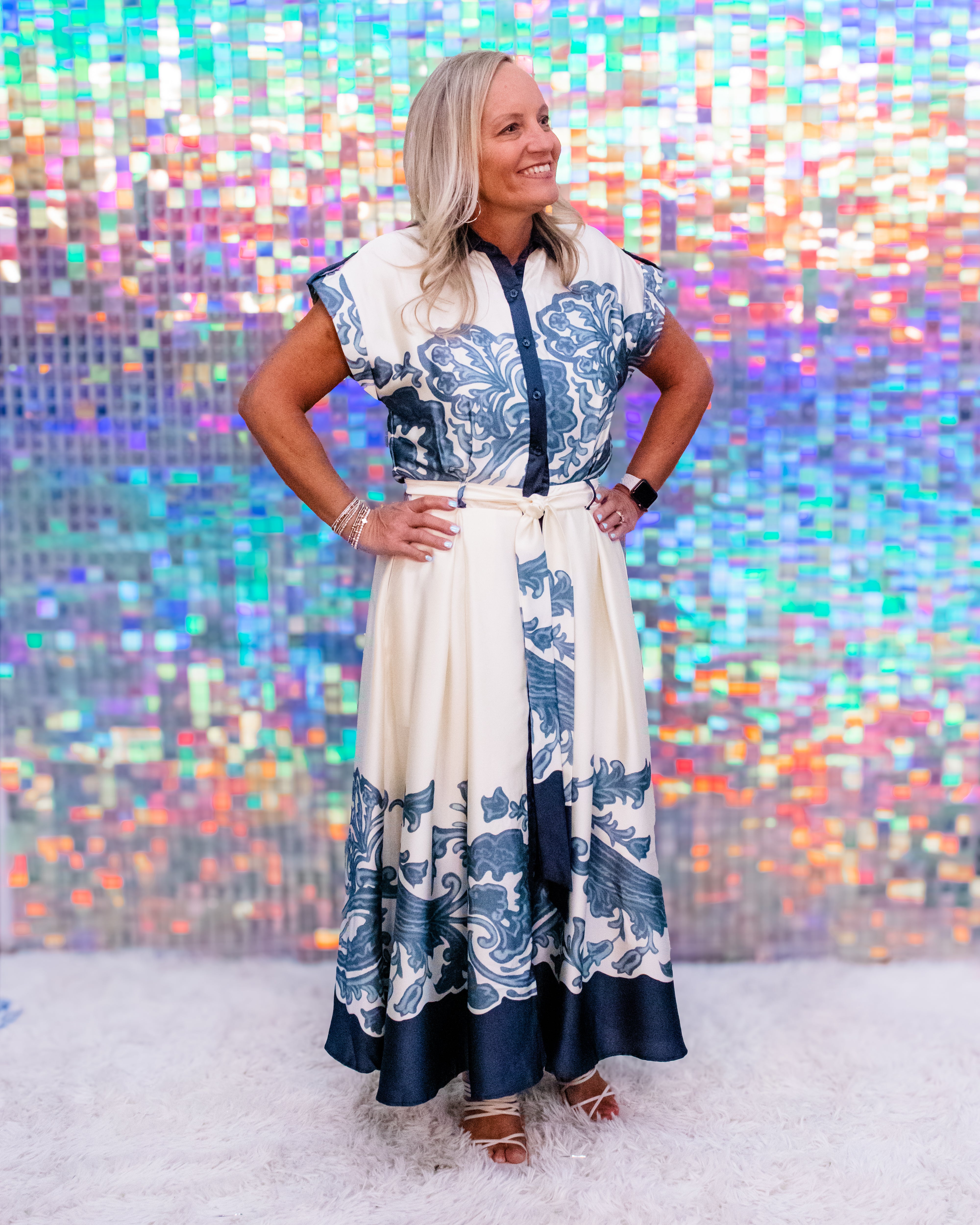 This stunning blue print satin dress is pure elegance from top to bottom. Crafted in a silky satin fabric, it flows effortlessly with a long, graceful silhouette that makes every step feel glamorous. The bold blue print adds just the right pop of statement style, while the luxe sheen catches the light beautifully. Perfect for weddings, formal events, or a night out where you want all eyes on you—just add your favorite heels and sparkle.