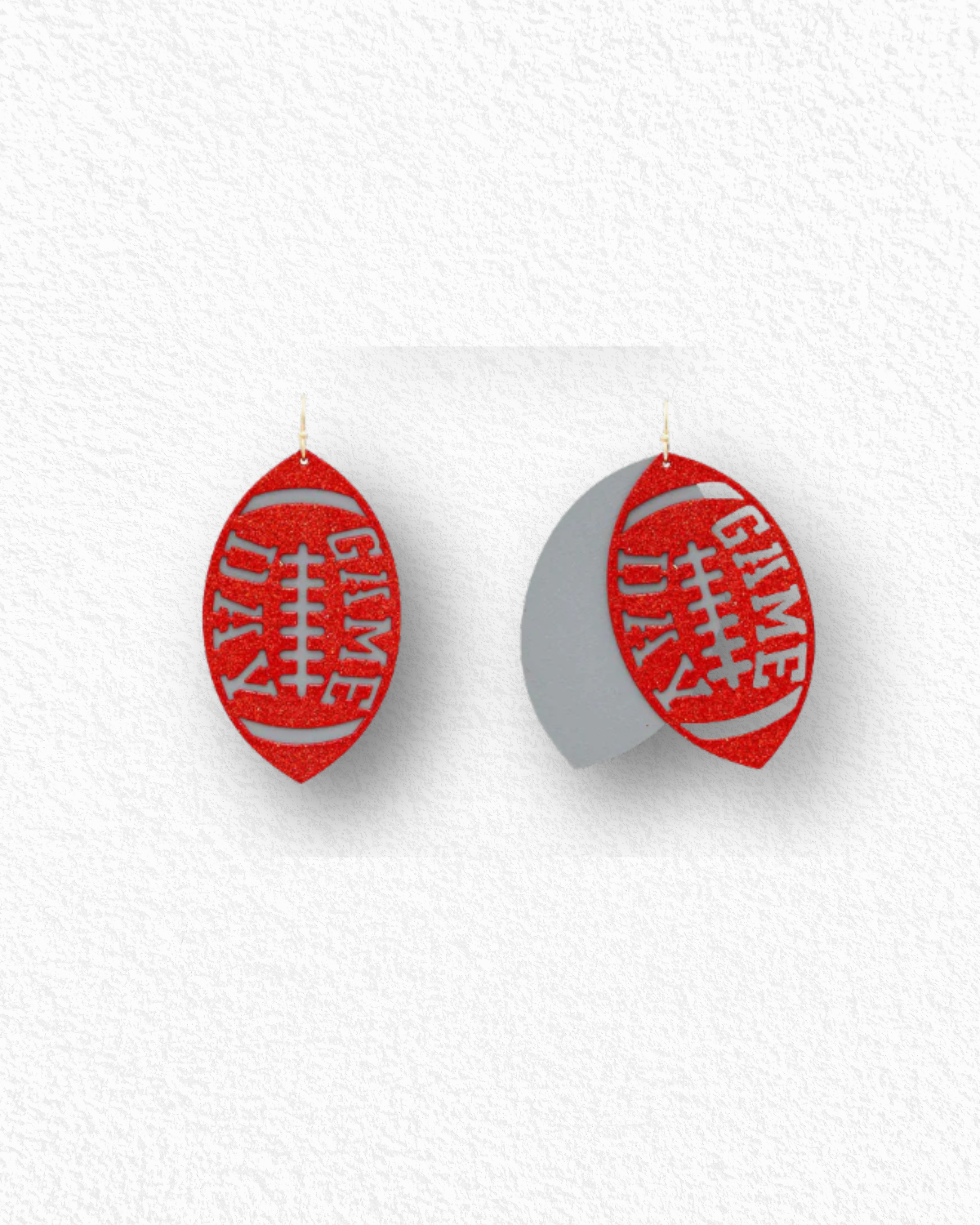 Grey Metal and Maroon Glitter Gameday Football Earrings – These 2" earrings feature a sleek grey metal football design filled with sparkling maroon glitter for the perfect pop of team spirit. Lightweight and fun, they’re a touchdown for any gameday look.