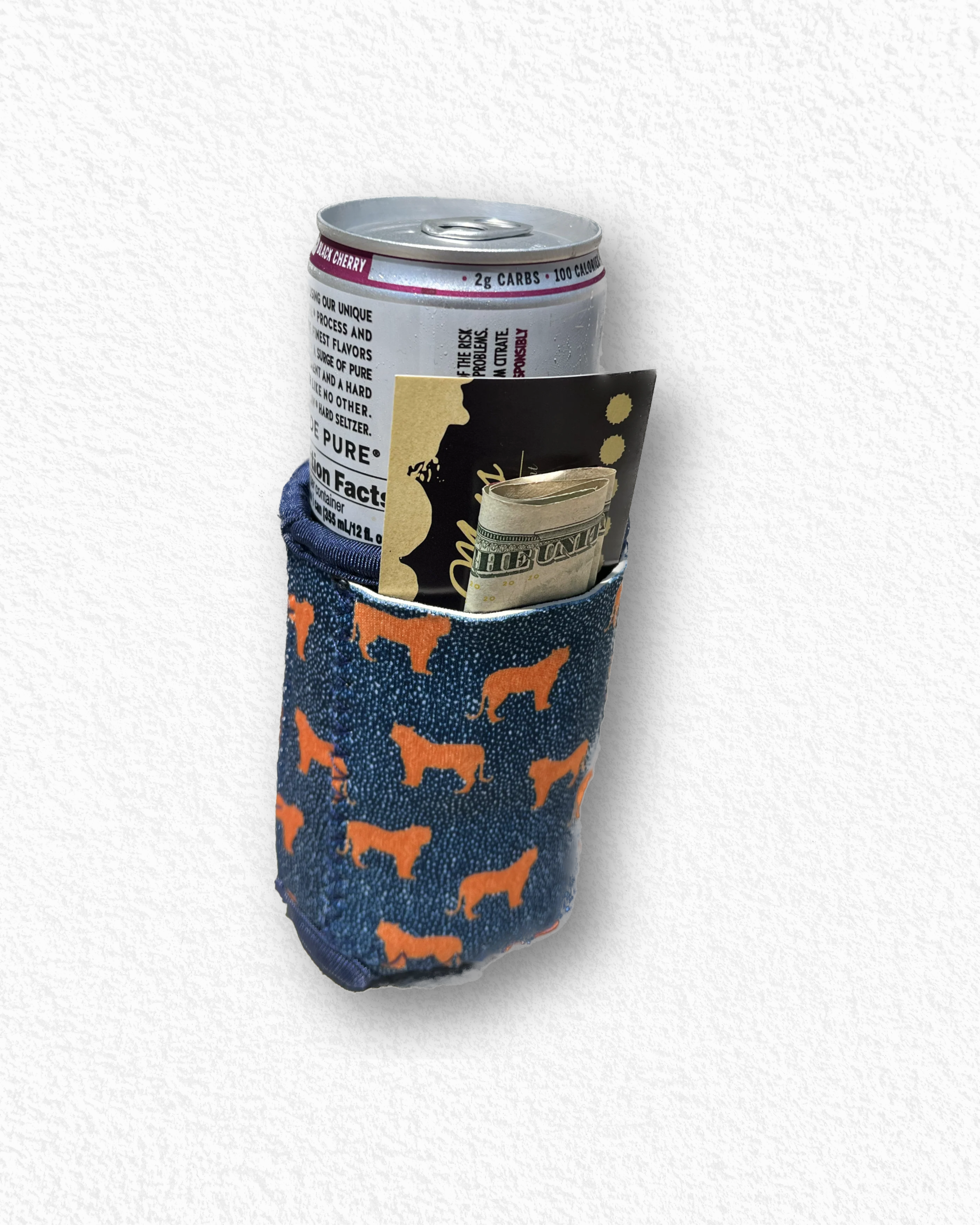 Game day hugger, fits standard soda size can and even can fit a slim can, has a pocket perfect for a card or ID! Mix fun with practicality!