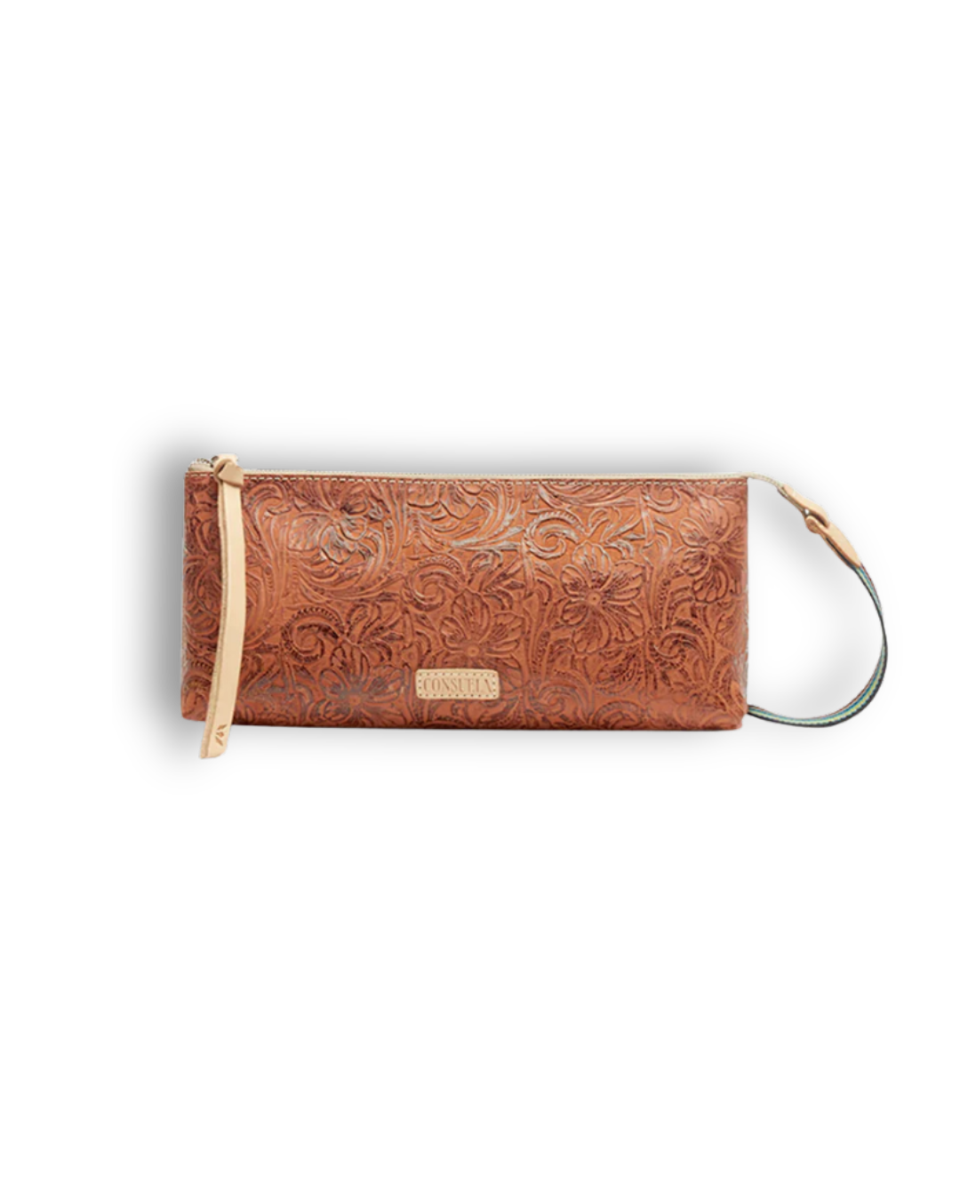 Our Sally Tool Bag is ideal for organizing cosmetics, pencils, and art supplies inside a larger tote. It also serves as a versatile day to evening clutch! Our tool bag features our Sally tooled leather exterior and a woven handle.