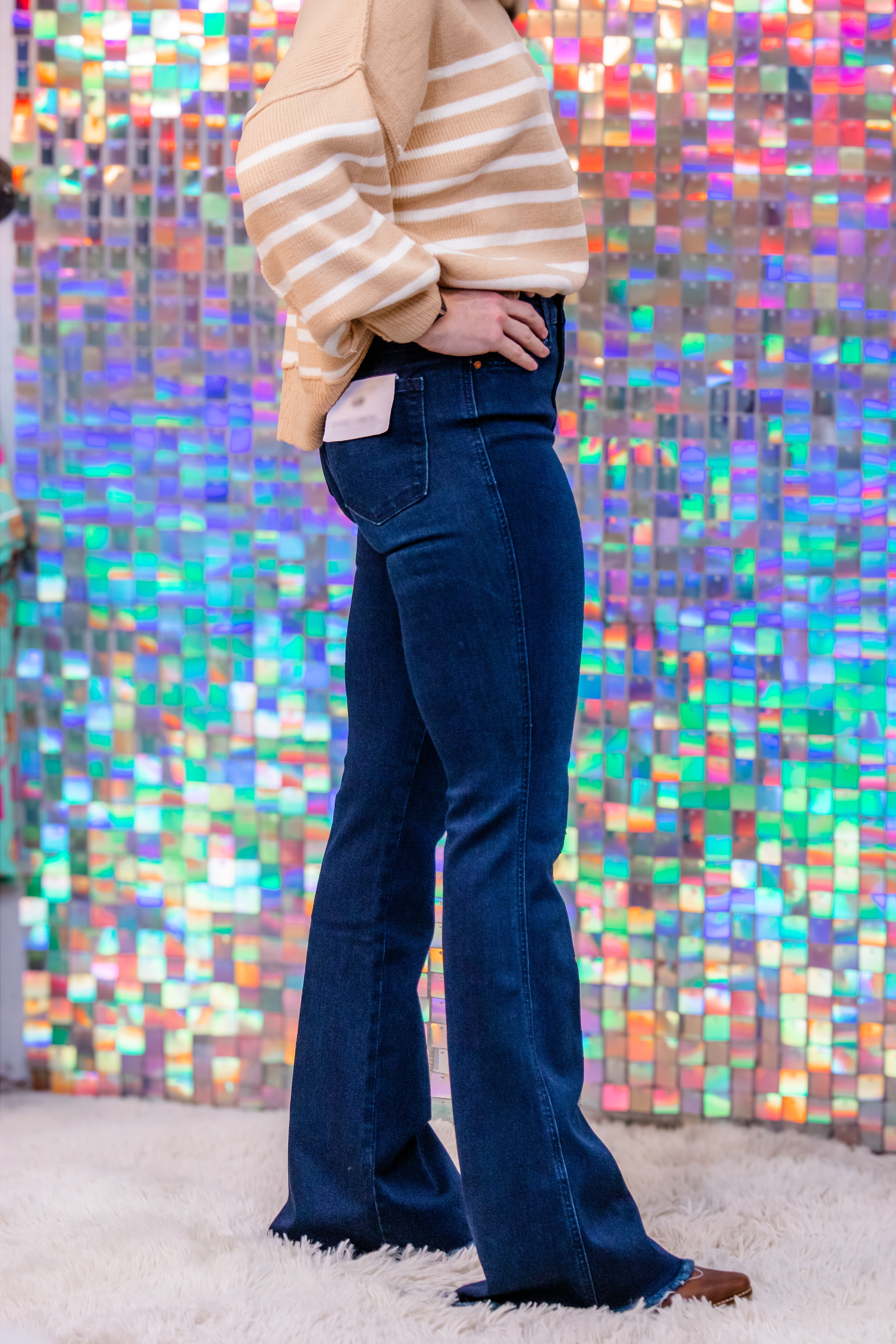 High rise flare jeans in stretch denim with frayed hem. Deep wash design brings a vintage retro vibe for daily wear.
