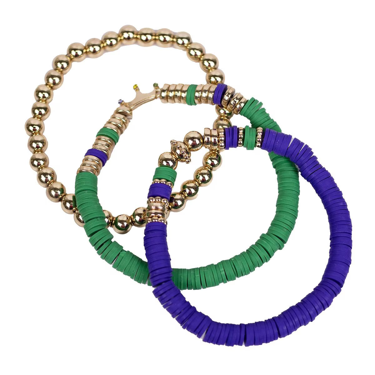Let the good times roll with the Bons Temps Bracelet Stack! This festive set layers perfectly to capture the vibrant spirit of Mardi Gras, featuring playful pops of purple, green, and gold. Designed for effortless stacking, these stretch bracelets add instant party flair whether you’re dancing at a parade, toasting with friends, or just bringing a little carnival sparkle to your everyday style. Fun, lightweight, and easy to wear, this stack is your go-to accessory for celebrating life’s best moments.