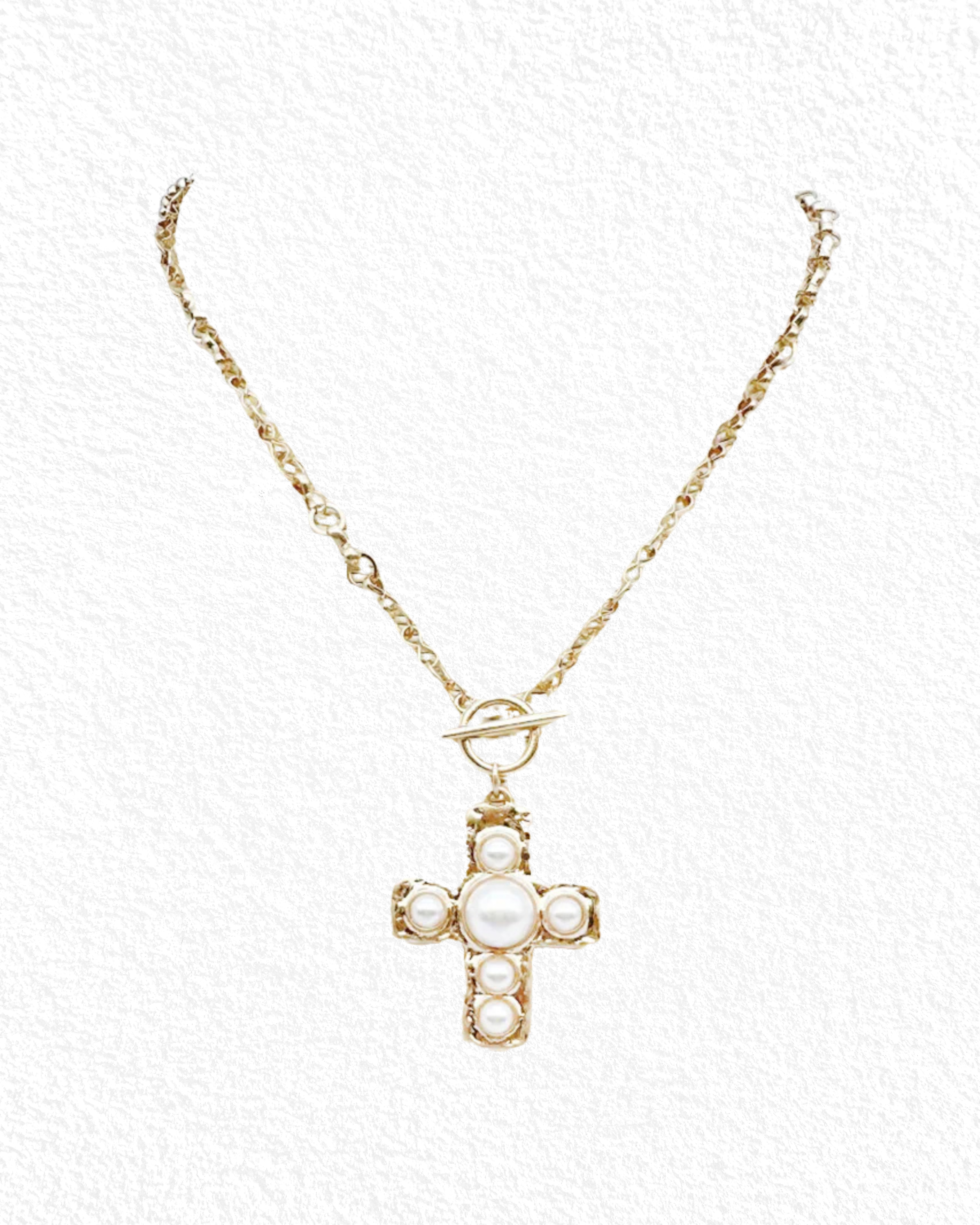 Let your faith shine in style with our Faithfully Chic Necklace. This statement piece features a bold gold toggle chain and a hammered cross pendant adorned with luminous faux pearls. The textured finish and center toggle closure add a modern twist to a timeless symbol of grace and strength.