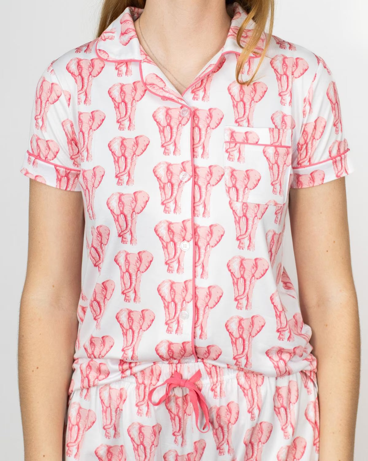 Drift off in playful comfort with our *Elephant Stomp Sleep Set*! Featuring a crisp white base sprinkled with adorable pink elephants, this set is as cute as it is comfy. The lightweight fabric feels soft against the skin, making it perfect for lounging, movie marathons, or a good night’s sleep. With its whimsical print and relaxed fit, it’s a sleepwear favorite you’ll reach for again and again—sweet dreams guaranteed!