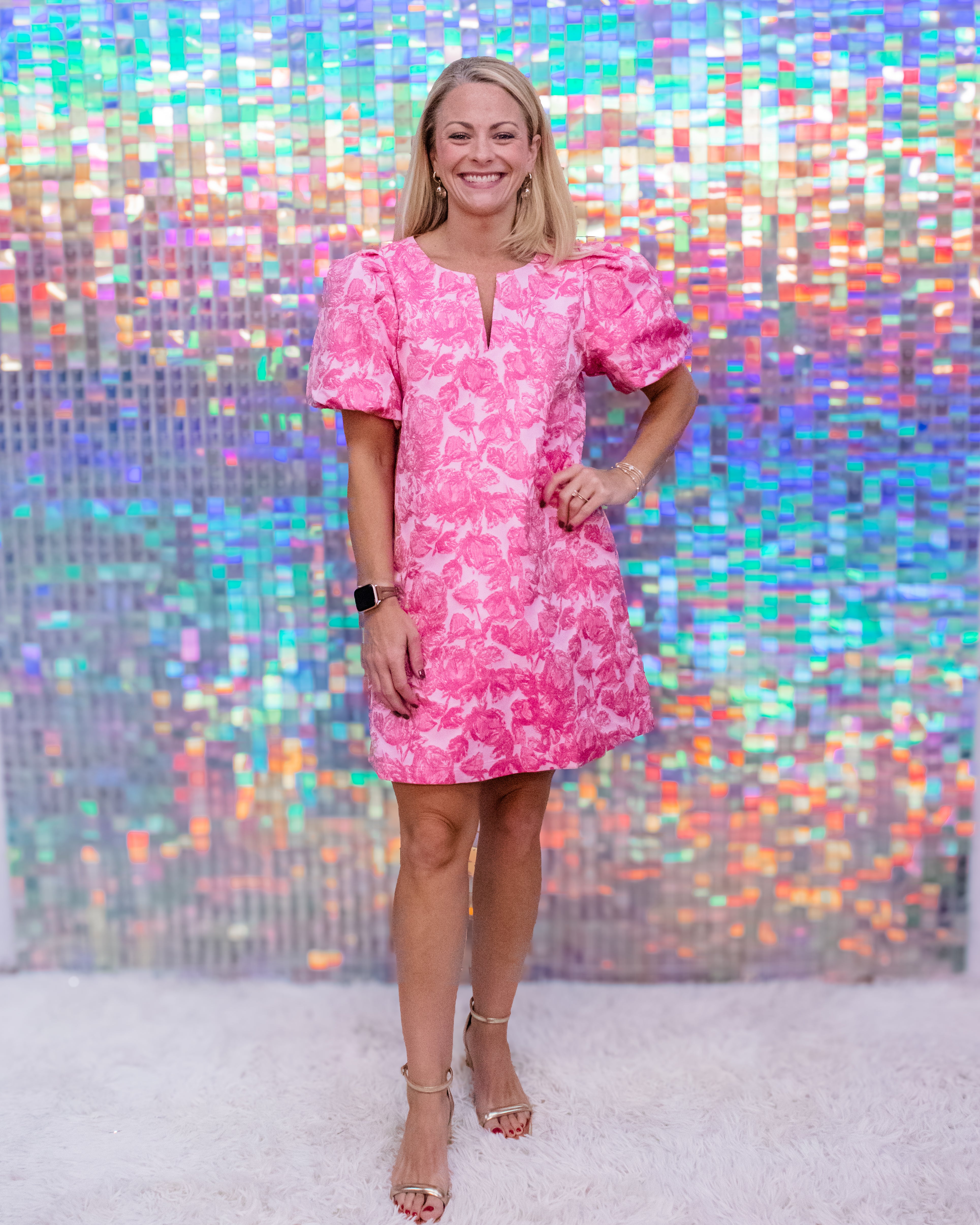 A striking fuchsia floral jacquard brocade dress crafted with rich texture and eye-catching detail. Designed with puff sleeves that add a romantic, feminine silhouette, this dress combines bold color with timeless elegance. The luxurious brocade fabric elevates the look, making it the perfect choice for weddings, parties, or any special occasion where you want to stand out with confidence and style.