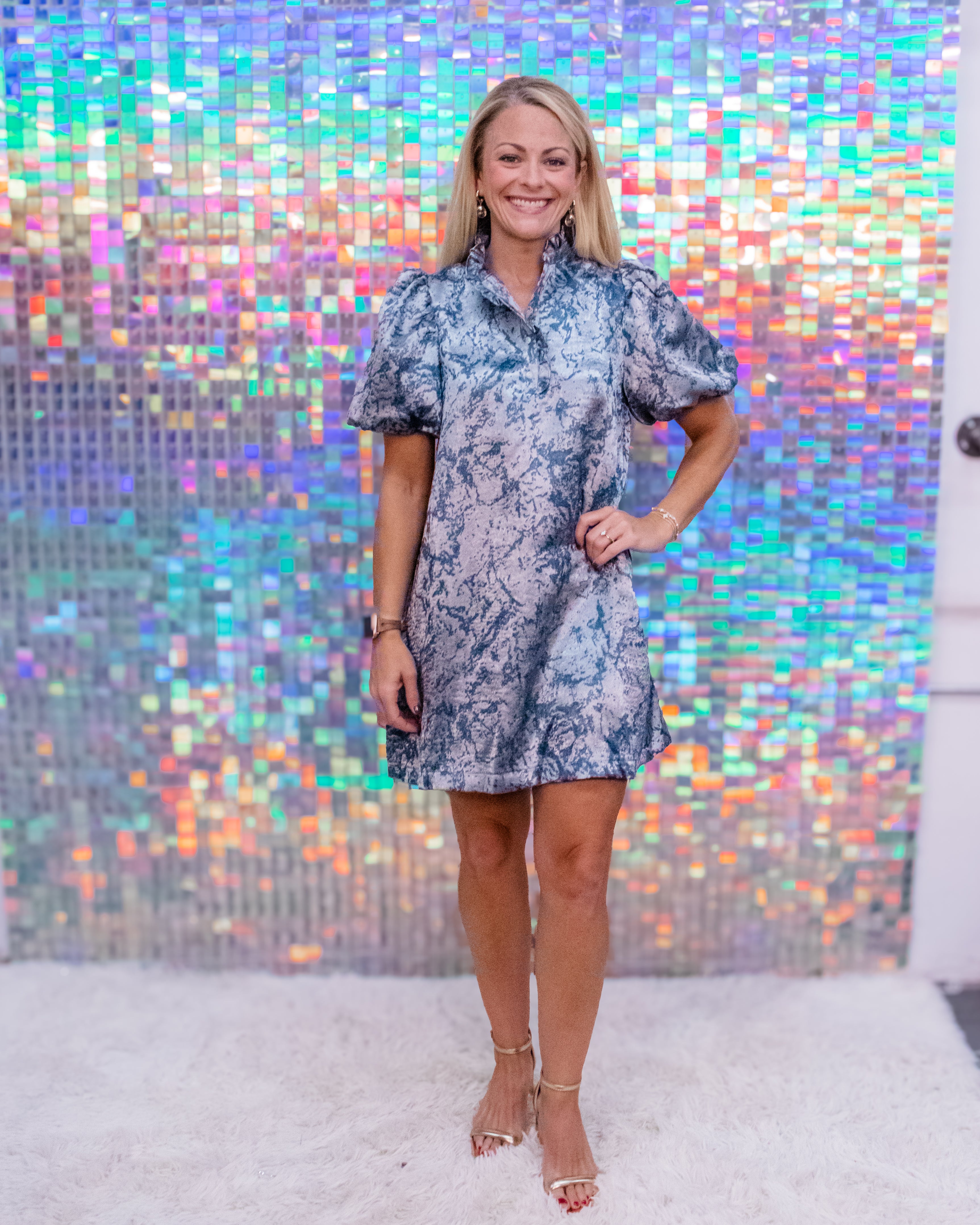 This is a metallic jacquard mini dress with a silvery-blue sheen and navy marbled pattern throughout. It features puff sleeves that add volume and drama, a subtle ruffled stand collar with a partial button front for a polished touch, and a straight silhouette that falls effortlessly. The fabric’s shimmer catches the light, making it perfect for an evening out, holiday parties, or any event where you want to shine
