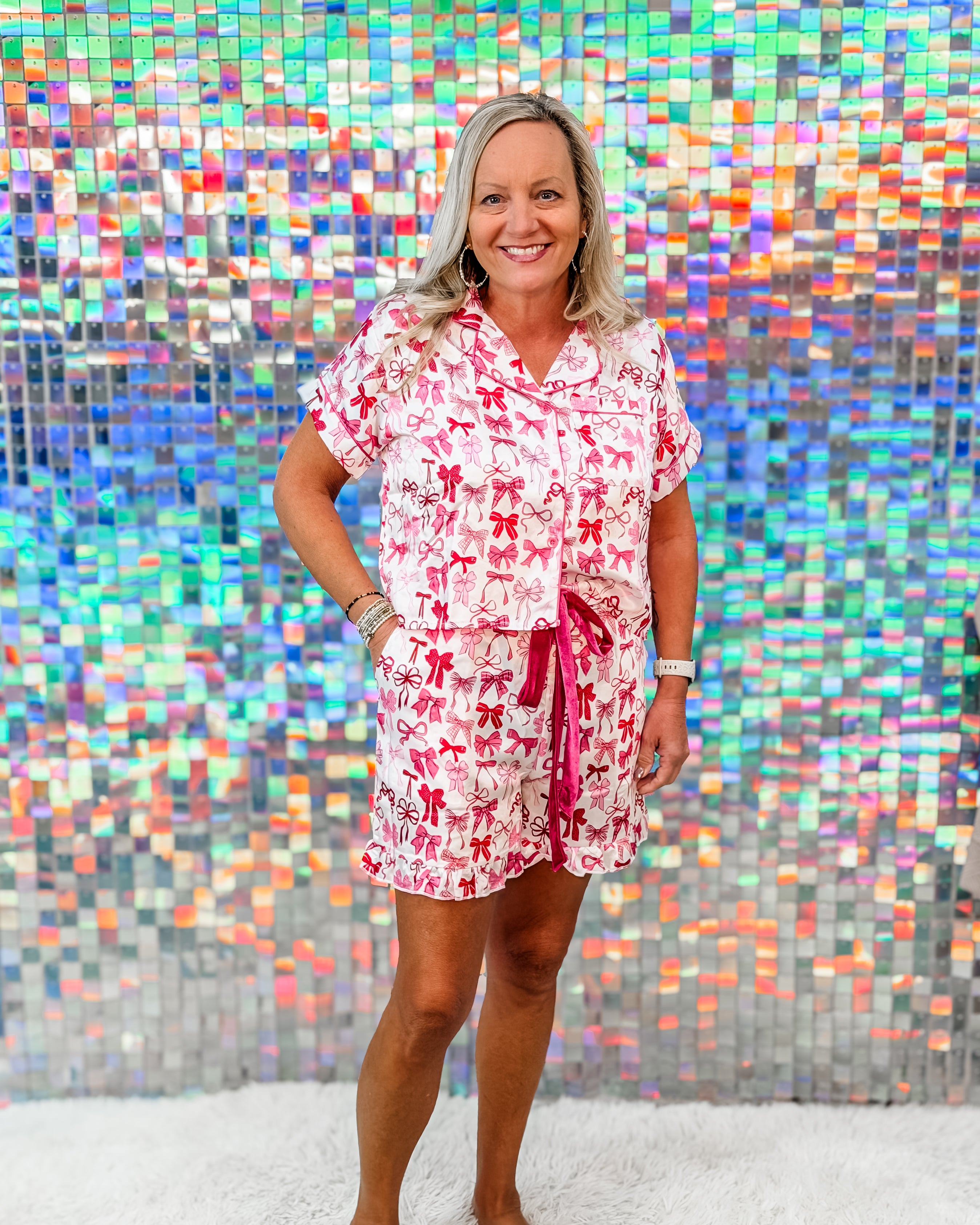 These cute bow pajamas shorts set features short sleeve buttton. Up tom with noted lapel and contrast piping details with front chest pocket and Simply Southern logo label, as qell as ruffle hem shorts with bow drawstring and slant pockets. Made of 100% polyester.