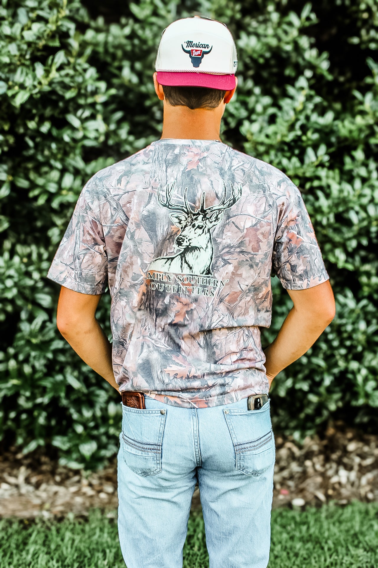 Camo short sleeve shirt with a large deer and the Simply Southern logo below. Similar design on left chest. 100% cotton. Unisex sizing.