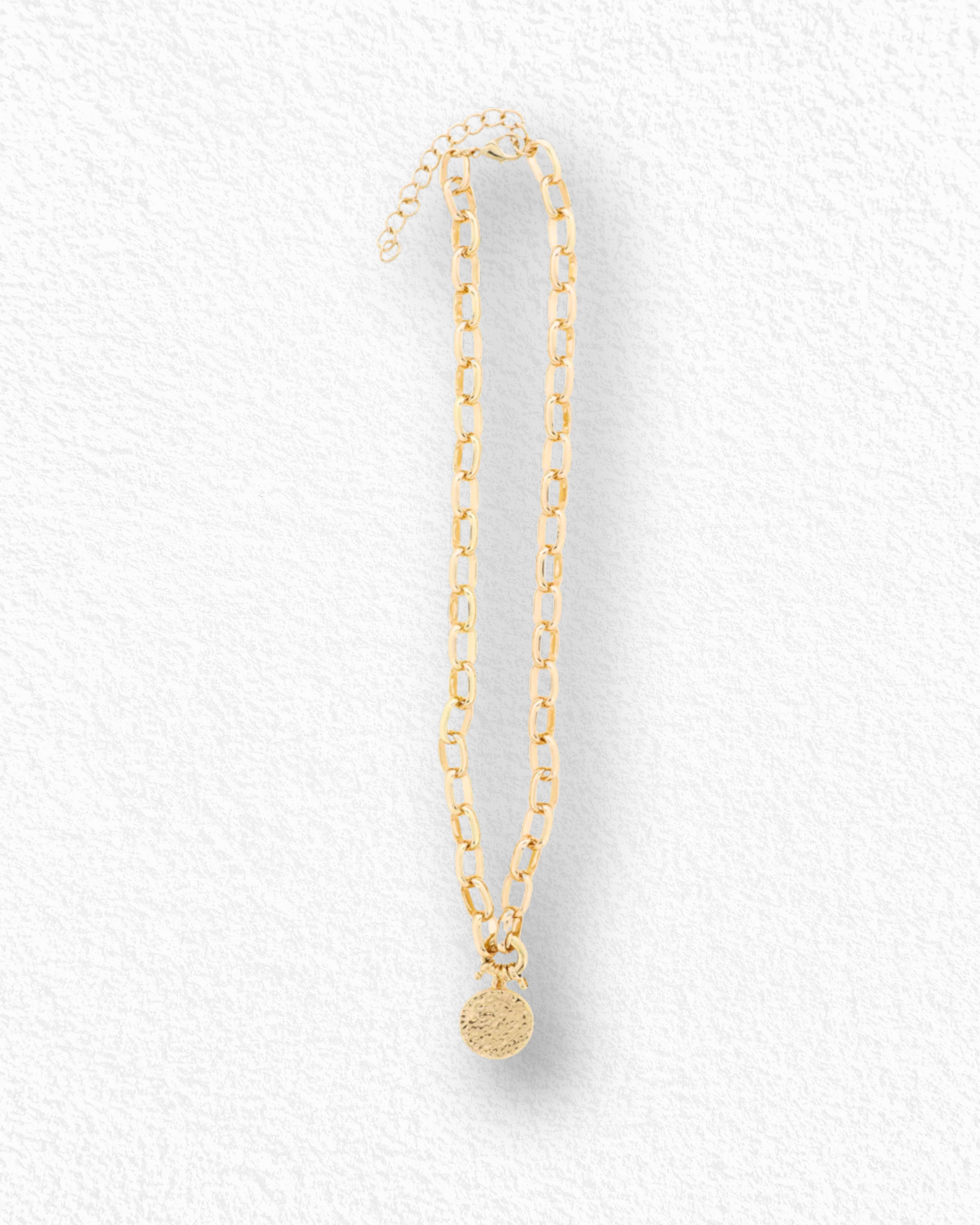 18k gold-plated oval link chain necklace featuring a hammered gold disk pendant. The textured finish of the disk adds a touch of organic elegance, while the bold oval links bring a modern, statement-making edge. Lightweight yet luxurious, this necklace layers beautifully with other chains or stands out on its own as a timeless accessory.
