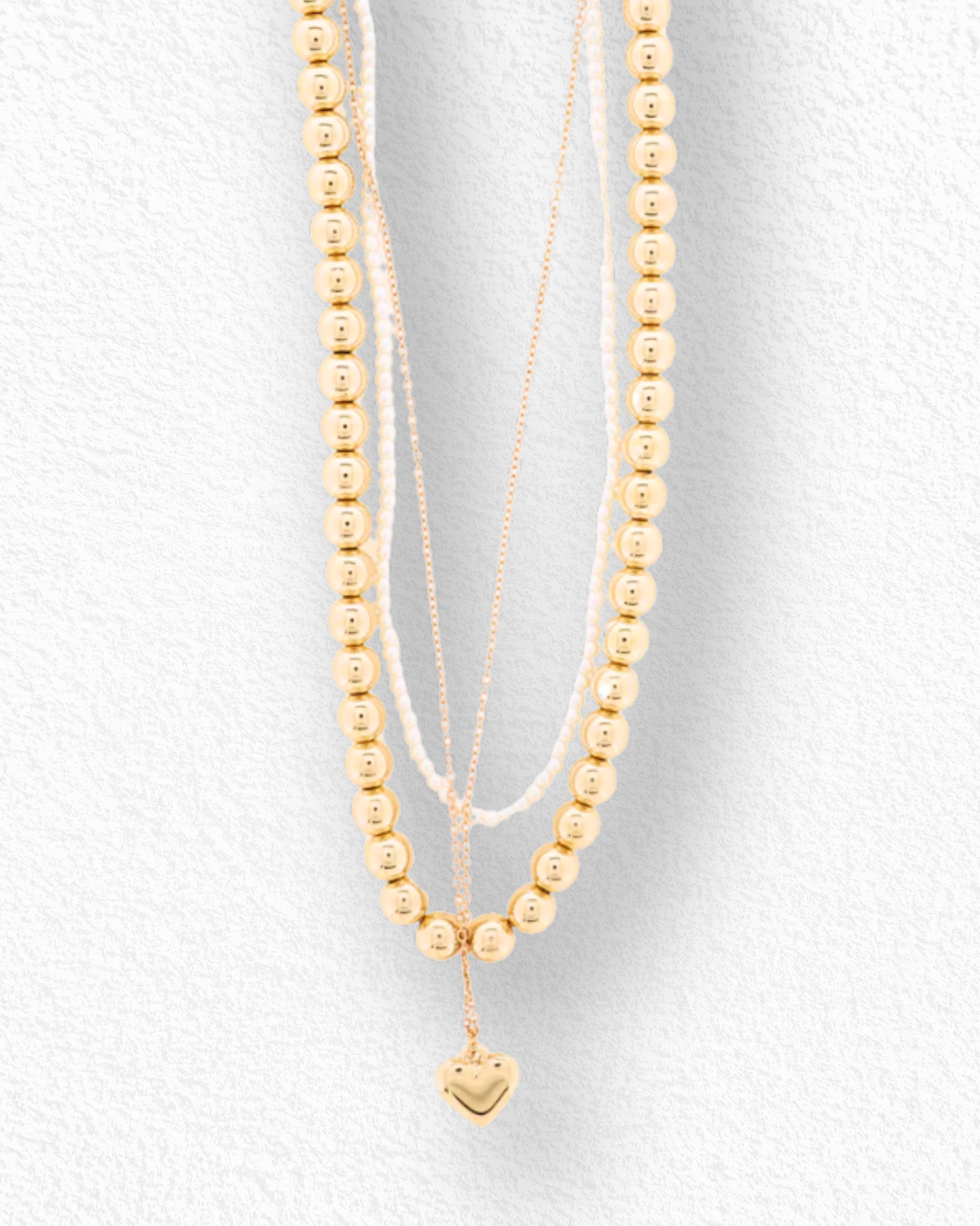 Elevate your everyday style with this **18K Gold Plated Gold & Pearl Beaded 3-Strand Necklace**, a dreamy mix of elegance and charm. Featuring three dainty layers of gold and pearl beads, it’s finished with a shining gold heart pendant for that perfect touch of romance. Whether you’re dressing up a simple tee or adding a flirty sparkle to date-night looks, this necklace is a total *must-have* for your jewelry collection.