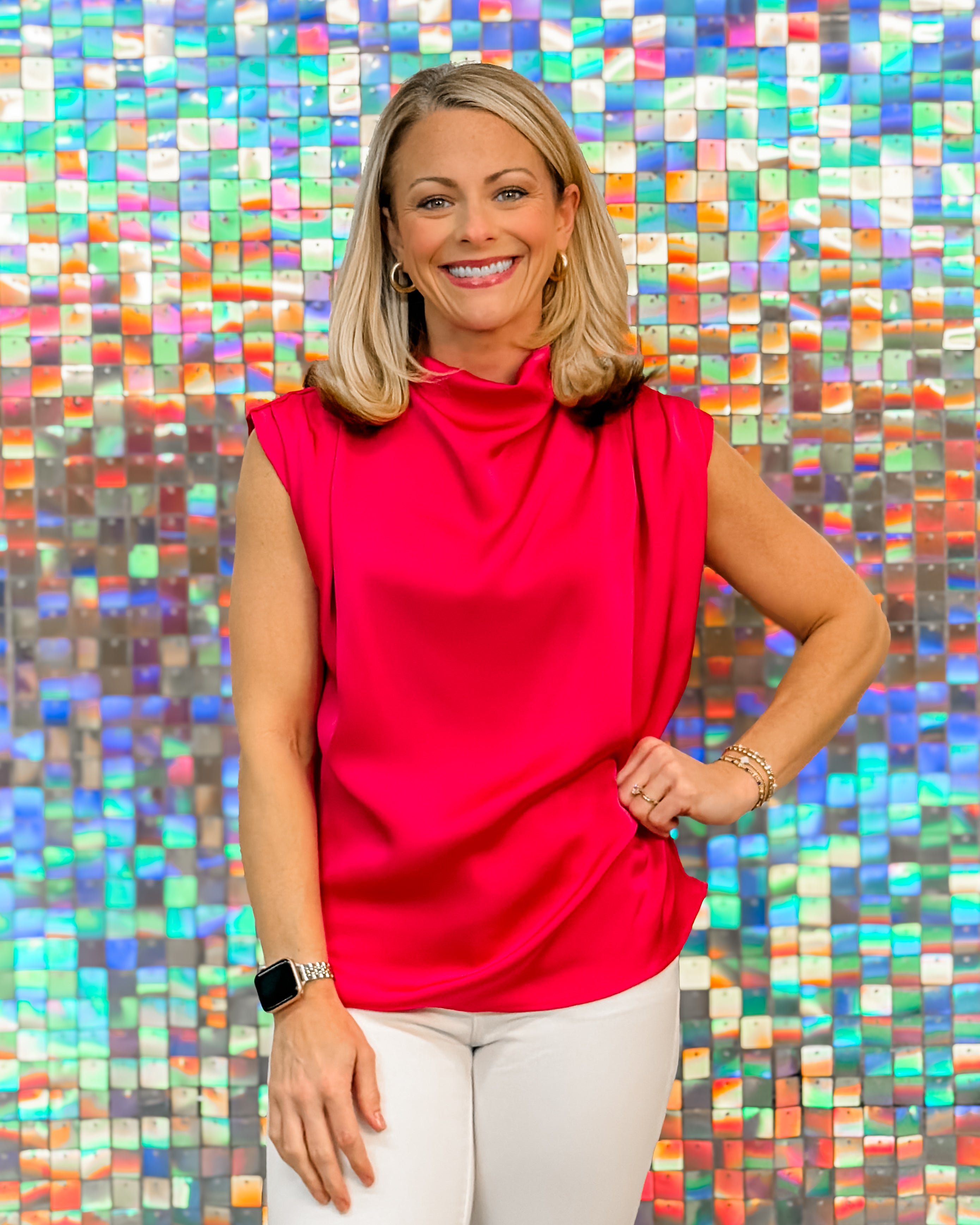 This sleeveless top features a beautiful cowl neckline that drapes effortlessly for a soft, flattering look. The delicate pleat detailing adds texture and movement, giving it an elevated feel while still being easy to wear.