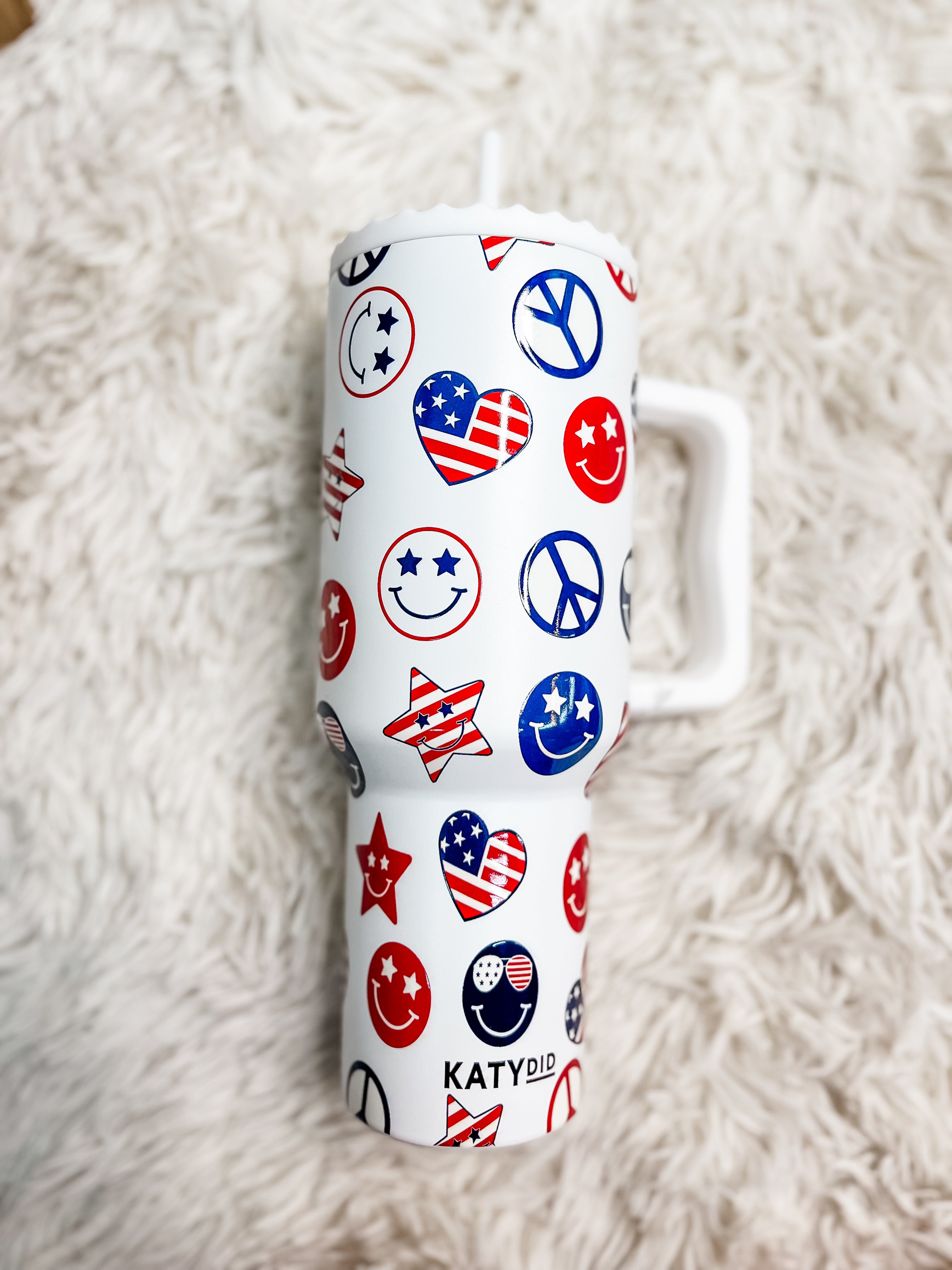Featuring a vibrant design of happy faces adorned with the iconic stars and stripes, this tumbler is the perfect accessory for those who love to infuse joy into their daily routines. The crisp white backdrop adds a touch of freshness, making it a versatile choice for your morning coffee, refreshing water, or even a chilled glass of your favorite beverage.