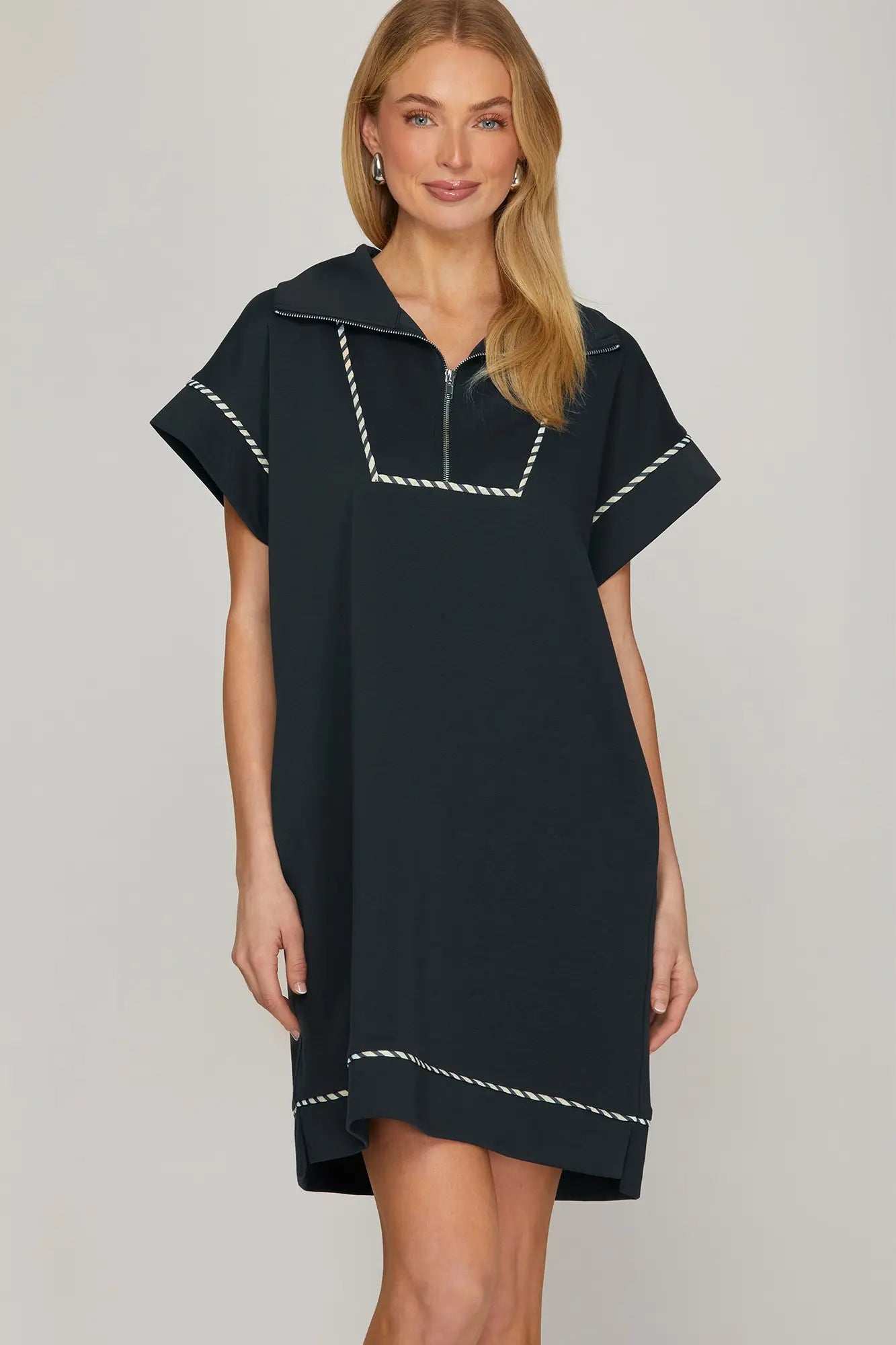 This short sleeve black knit mini dress features a structured collar with contrast binding that gives it that clean, elevated boutique look. The soft knit fabric keeps it comfortable and easy to wear, while the flattering silhouette makes it perfect for everything from busy days to casual nights out.