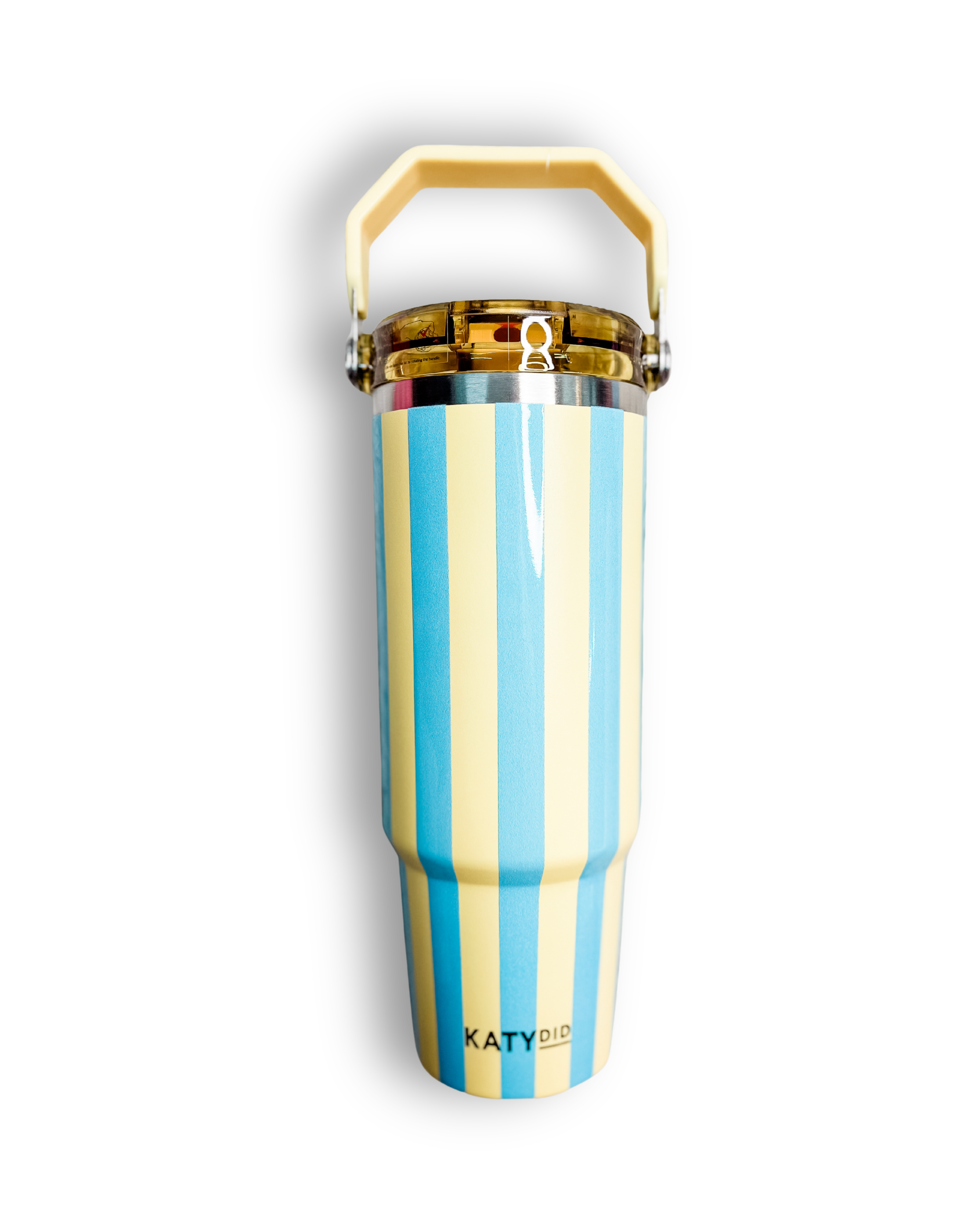 Hydration, but make it cute. Our striped tumbler cup in yellow and aqua blue is the perfect mix of trendy design and practical function. With playful pastel stripes and a sturdy handle, this travel tumbler cup keeps your drinks cold for hours (or hot if that’s your vibe). Lightweight yet durable, it’s designed for coffee runs, beach days, or those long road trips when hydration is non-negotiable.