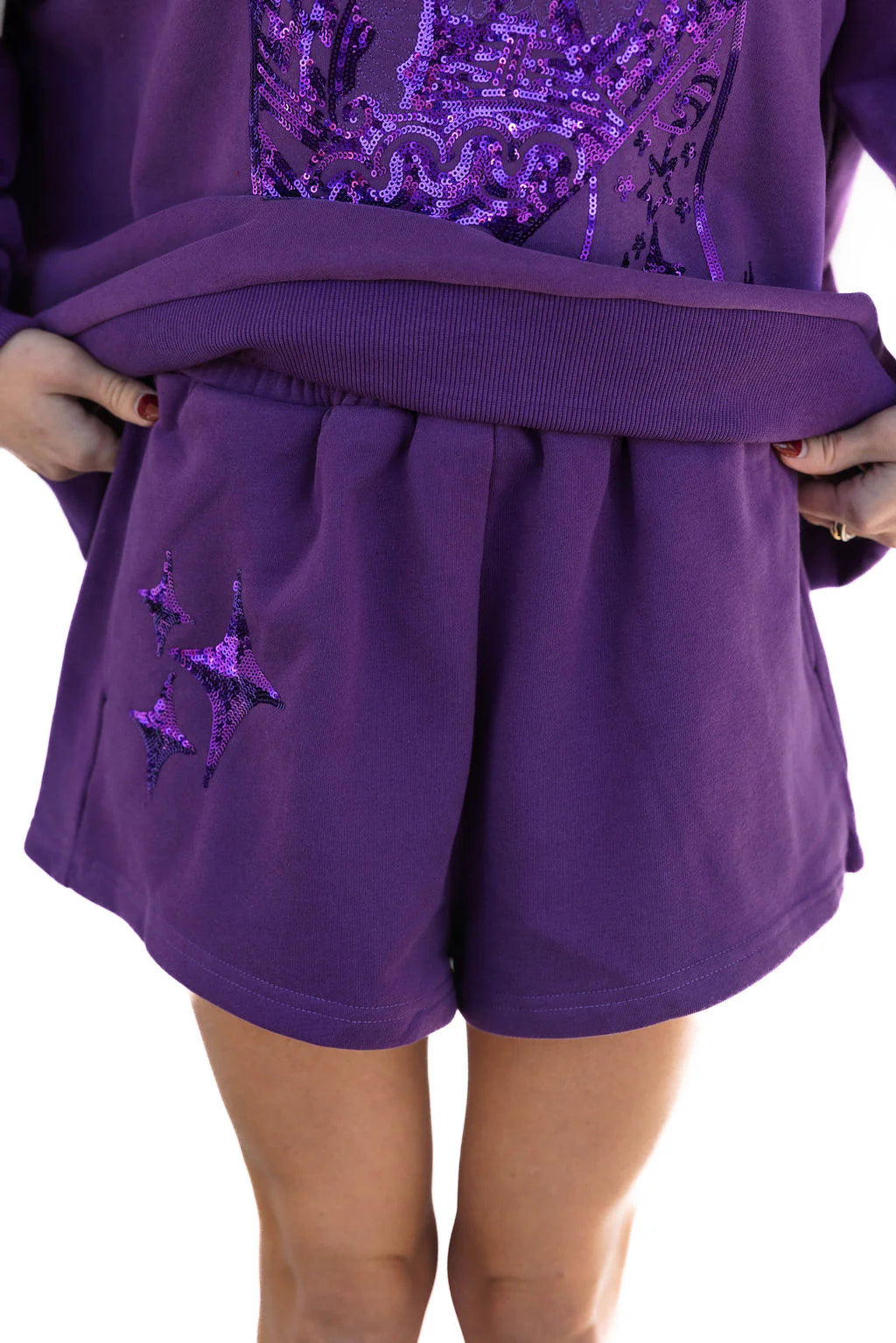 Add a pop of playful glam to your look with the Queen of Sparkles Purple Sparkle Logo Shorts. These vibrant, comfy shorts feature a bold purple hue with the signature Queen of Sparkles logo glistening in sequins across the front — the perfect mix of sporty and chic. Made from soft, high-quality fabric with an elastic waistband, they’re designed for effortless comfort while still bringing the sparkle.