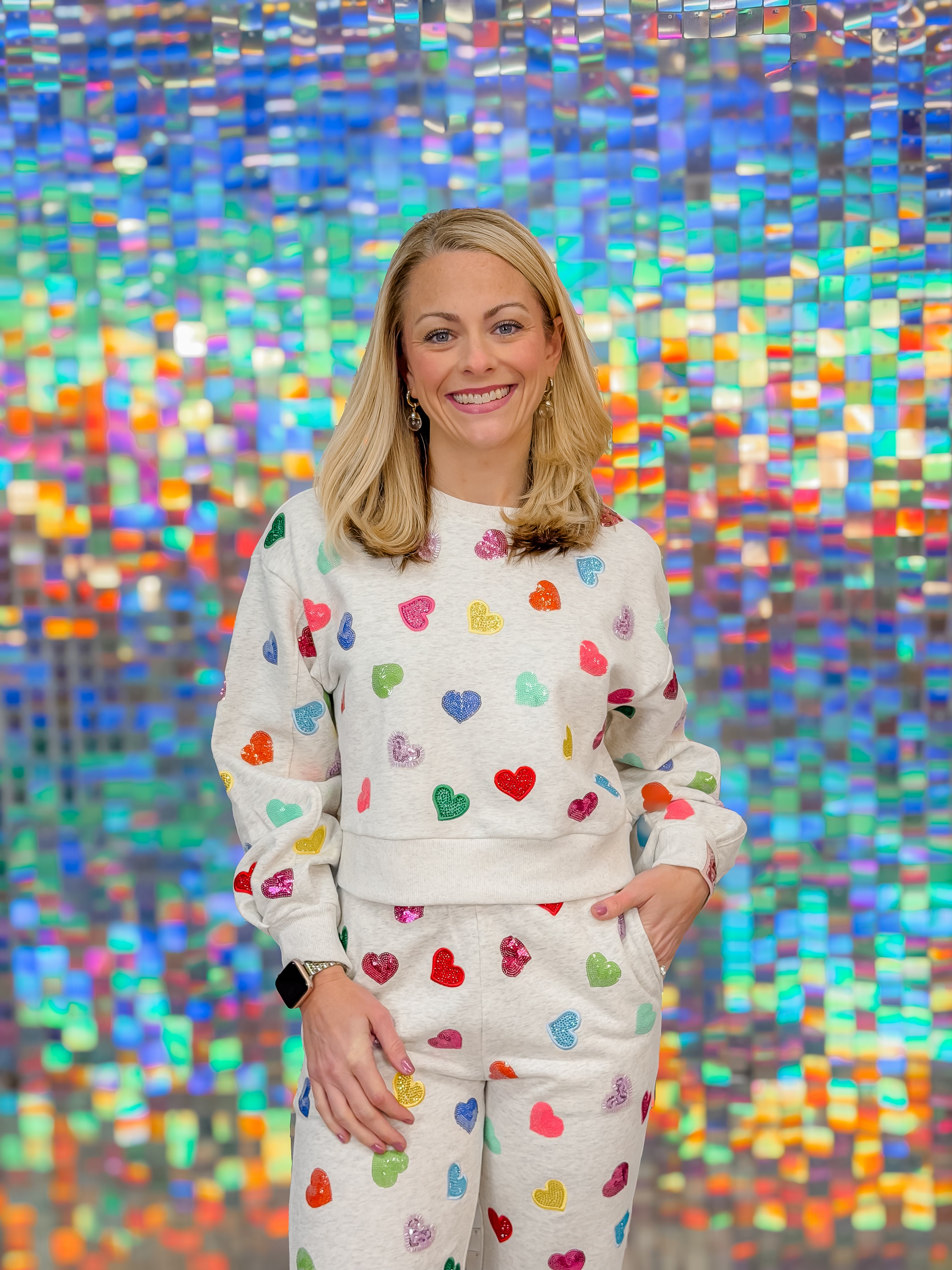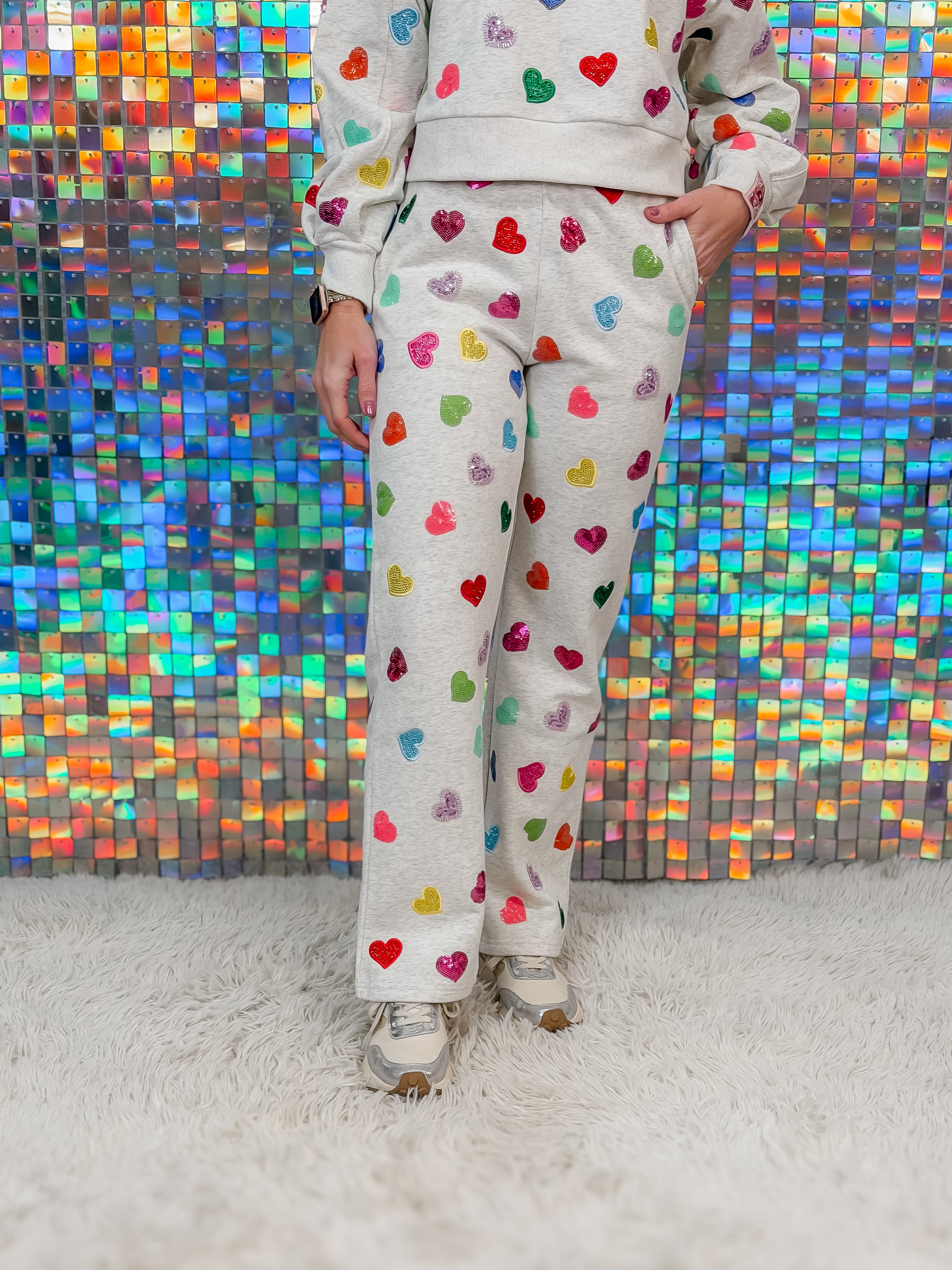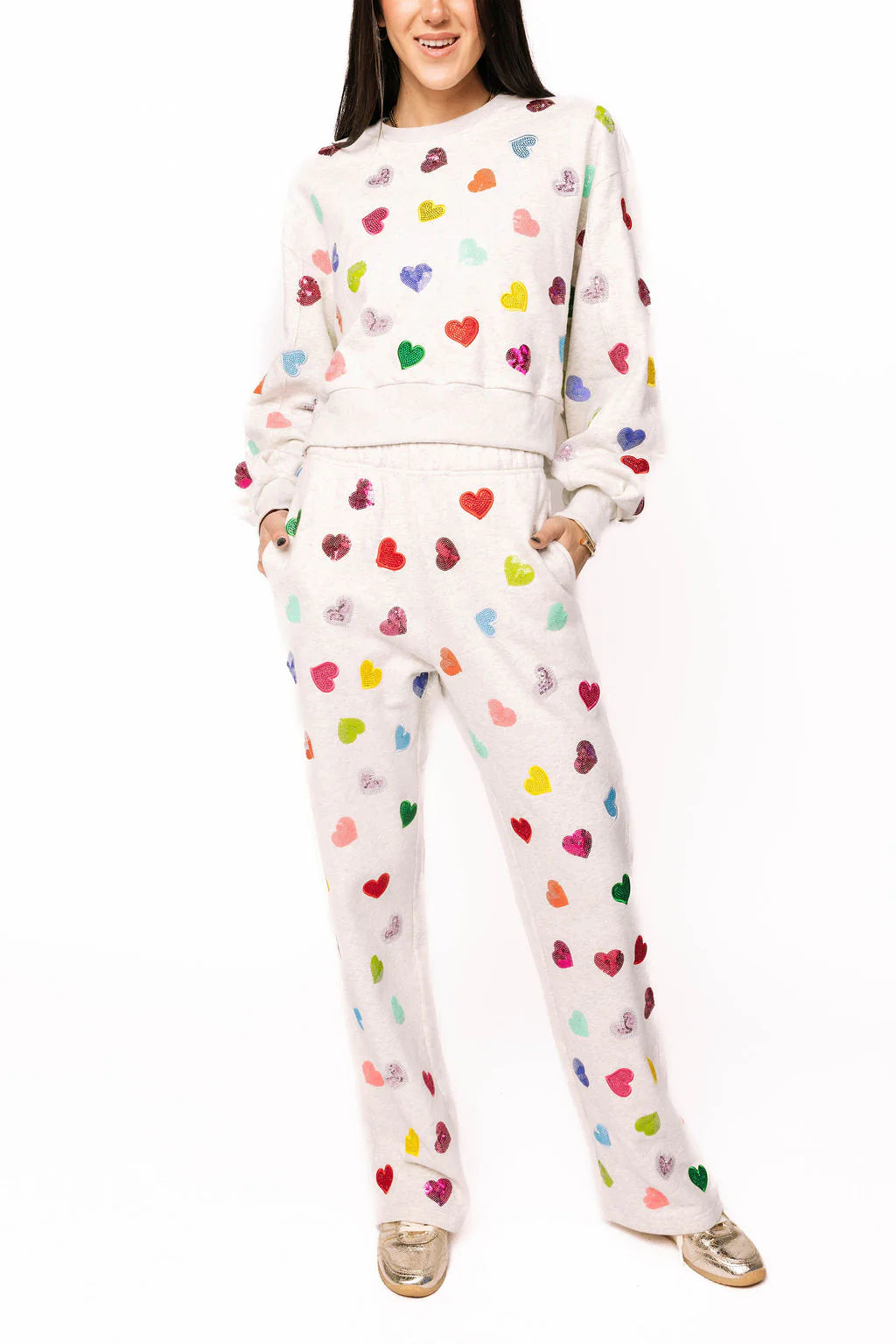 QOS Light Grey Multi Rhinestone Heart Sweatpants