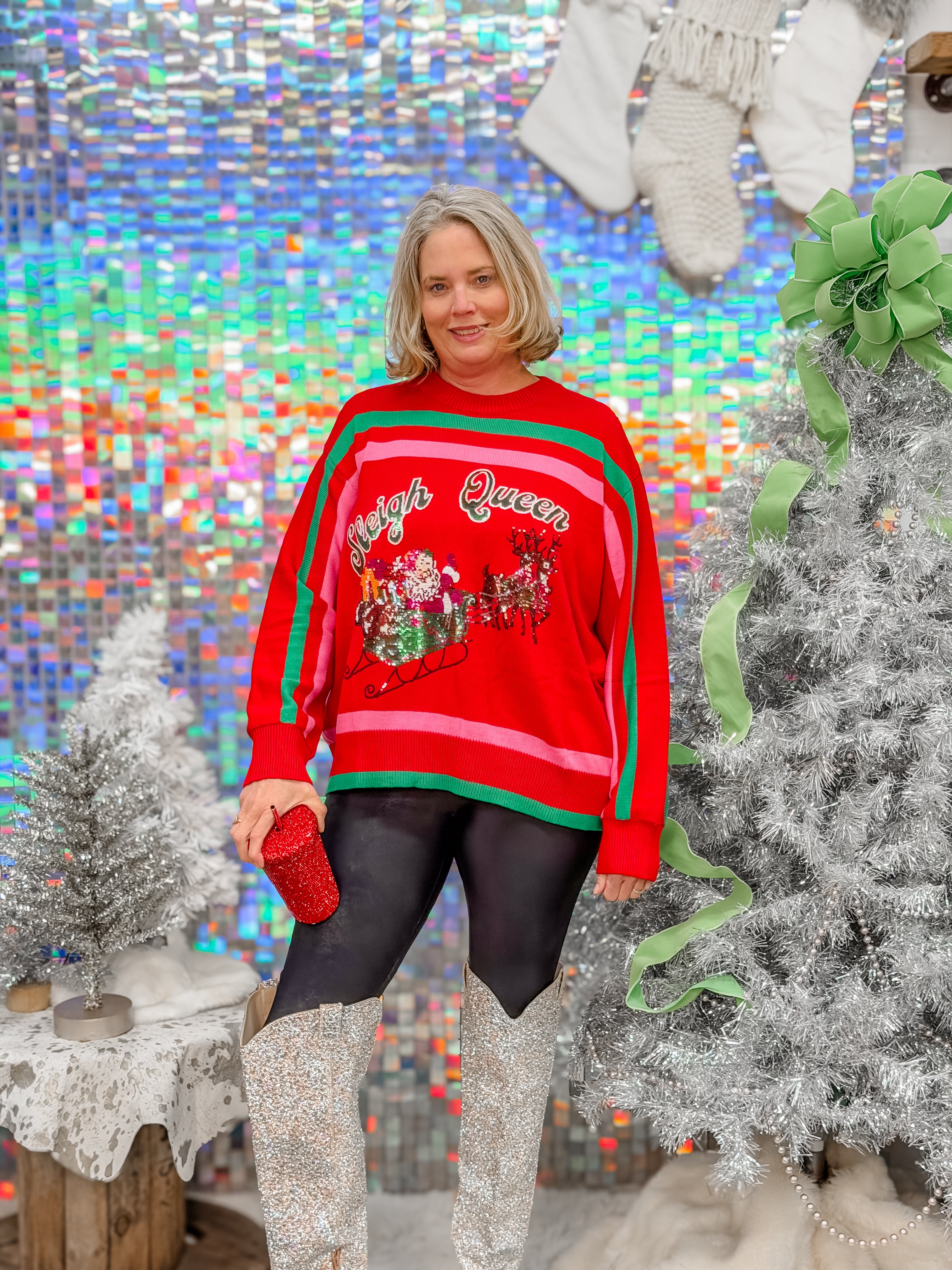Cozy up in holiday style with the 'Sleigh Queen' Stripe Sweater! This playful sweater features long sleeves and a comfortable crew neck, decorated with festive red, pink, and green stripes. Its sparkling sequin holiday design ensures you’ll shine bright at every celebration. Perfect for adding a cheerful touch to your seasonal wardrobe.
