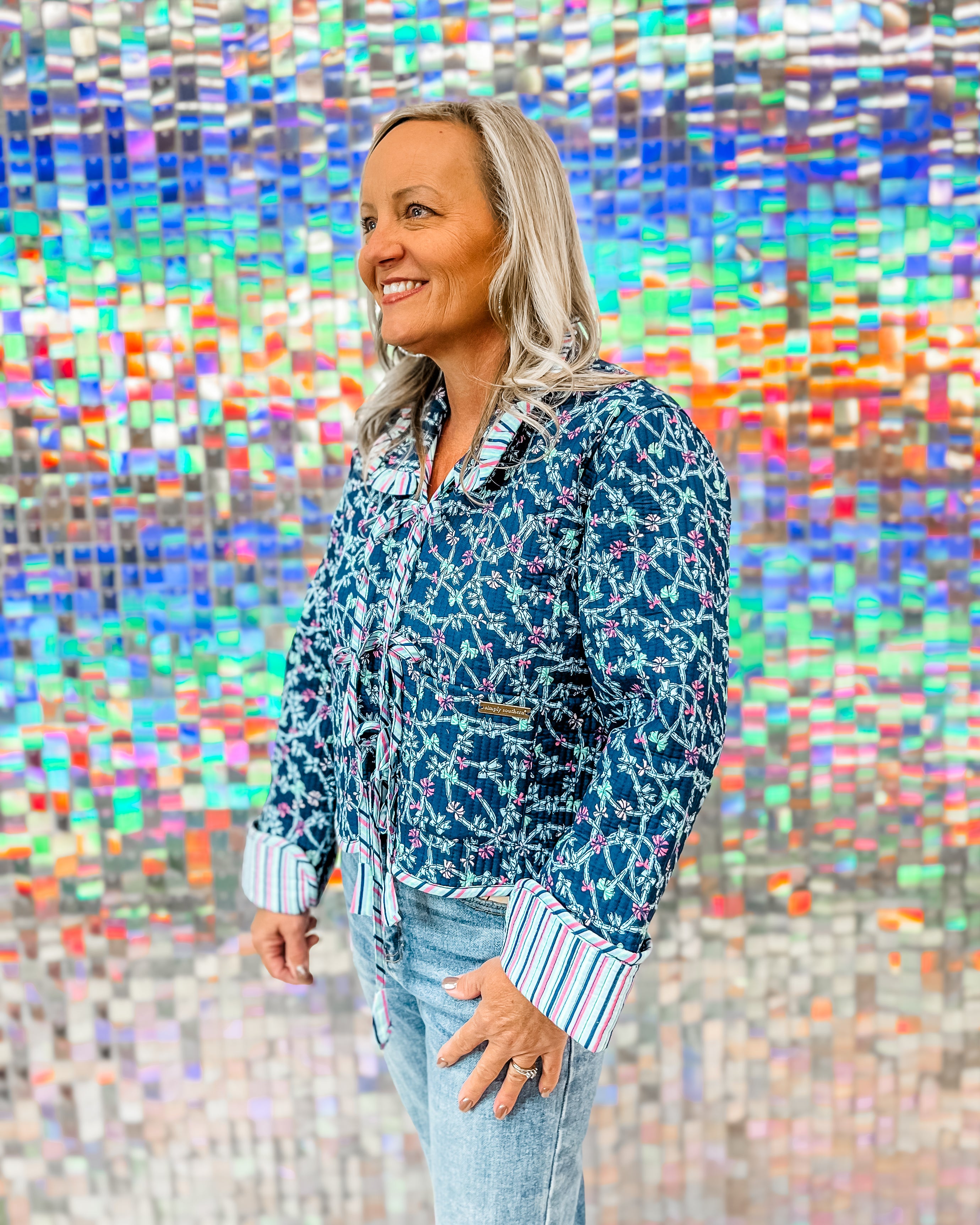 The Ophelia Jacket makes the perfectr layering piece. It features quilted design, ruffle detail collar, tie front closure, patch pockets, contrasting lining, ands Simply Southern logo label. Made of 100% cotton shell with 100% polyester lining.