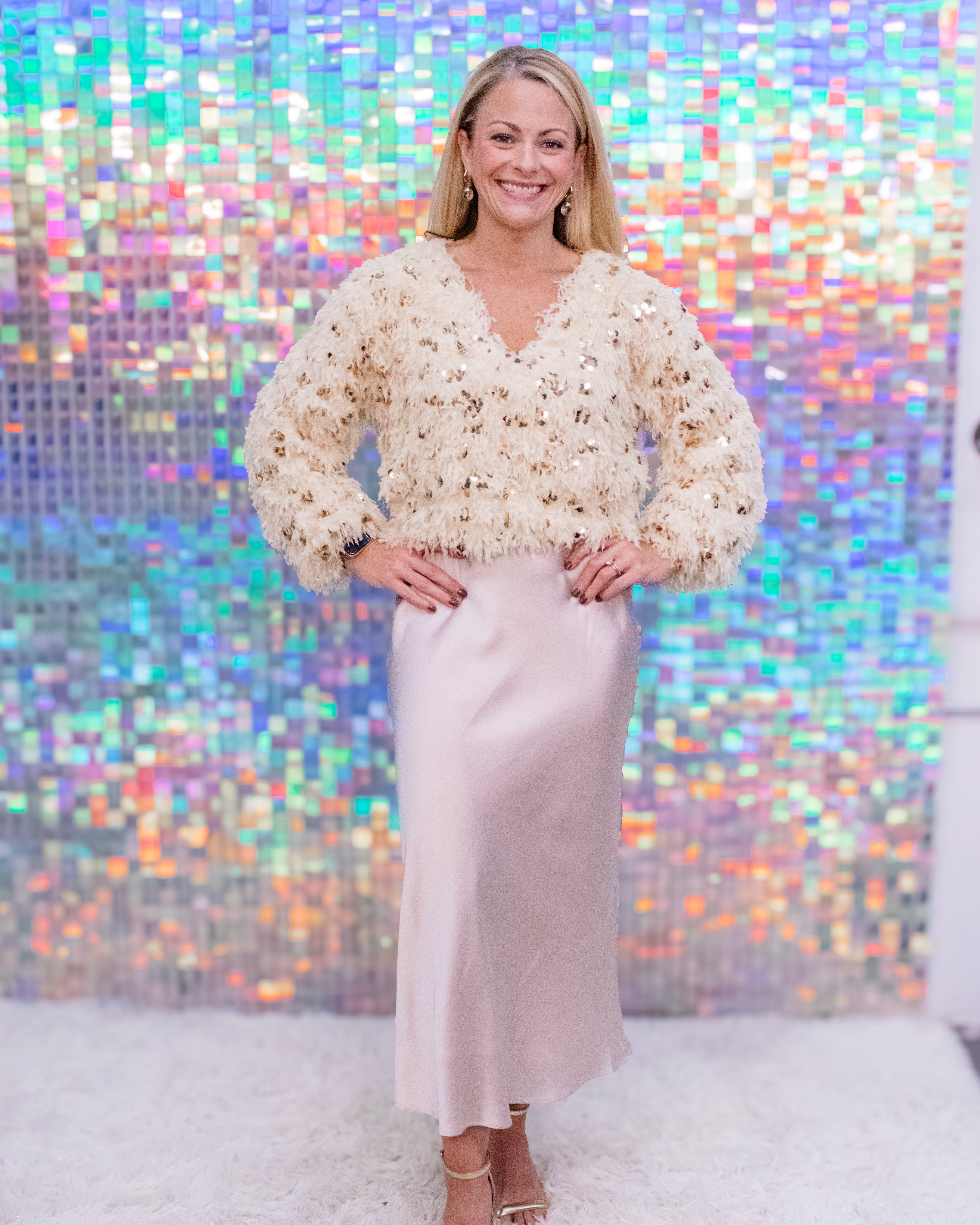 En Crème’s short furry jacket is a glam statement piece with soft textured fabric covered in shimmering gold sequins. Cropped in length and easy to style, it adds sparkle and warmth to any outfit—perfect for layering over dresses or pairing with denim for a chic, party-ready look. ✨
