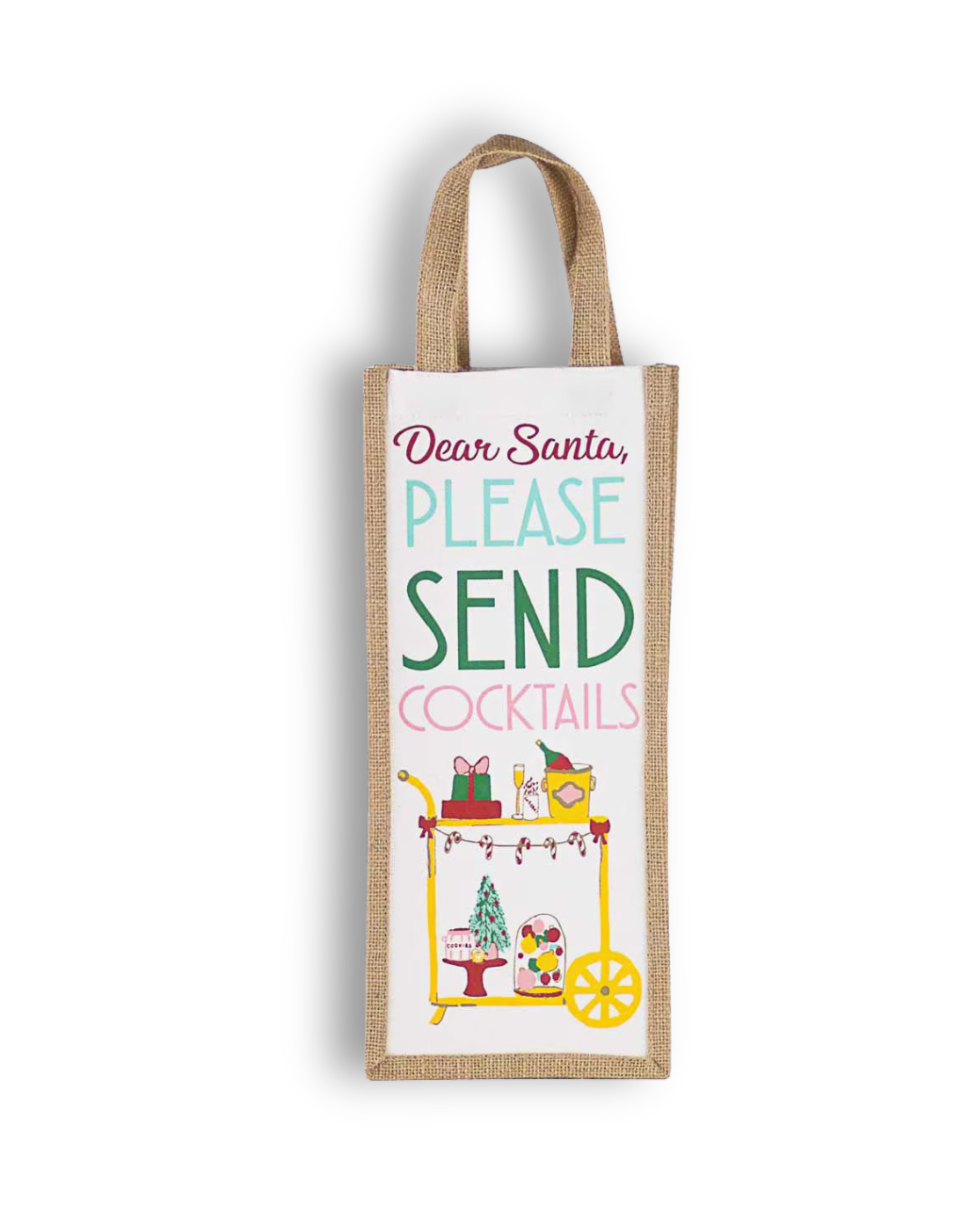 Bring the holiday cheer in style with the Santa Send Cocktails Wine Bag. Perfectly sized for gifting your favorite bottle, this festive bag adds a playful twist to holiday entertaining. With its seasonal design and cheeky “Santa Send Cocktails” message, it’s a fun and functional way to dress up wine, spirits, or bubbly for parties, hostess gifts, or stocking stuffers.