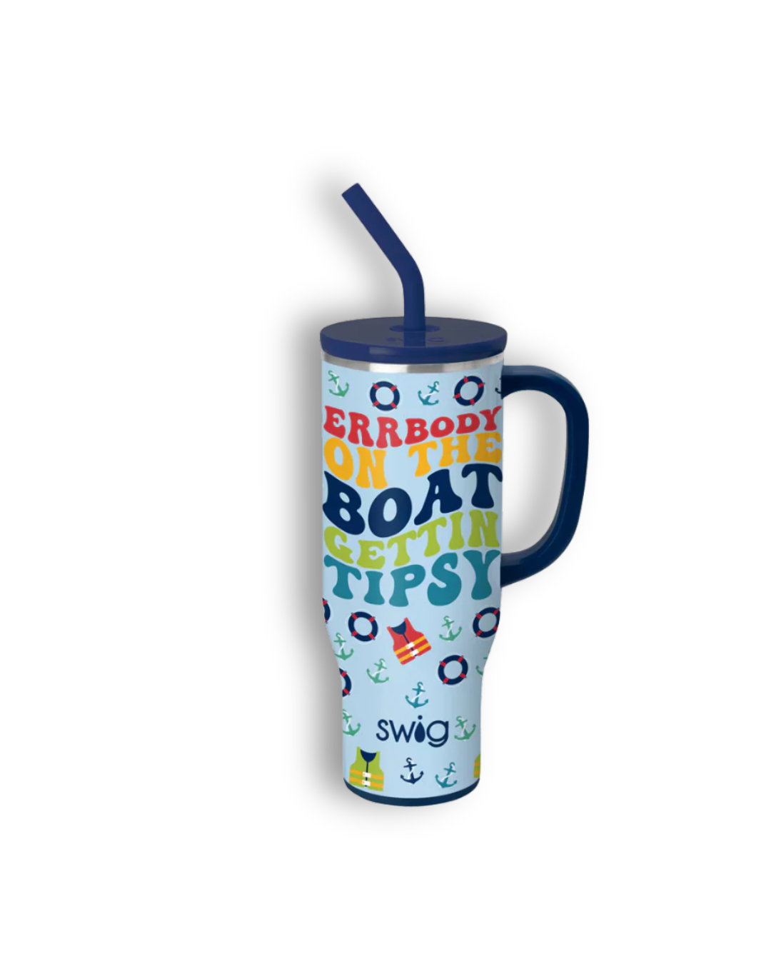 Mega sips, mega chill! 🧊 Errbody this summer is getting tipsy with Swig! 🍹 This drinking buddy design comes party ready with life jackets, anchors, and buoys on a pale glitter blue background.