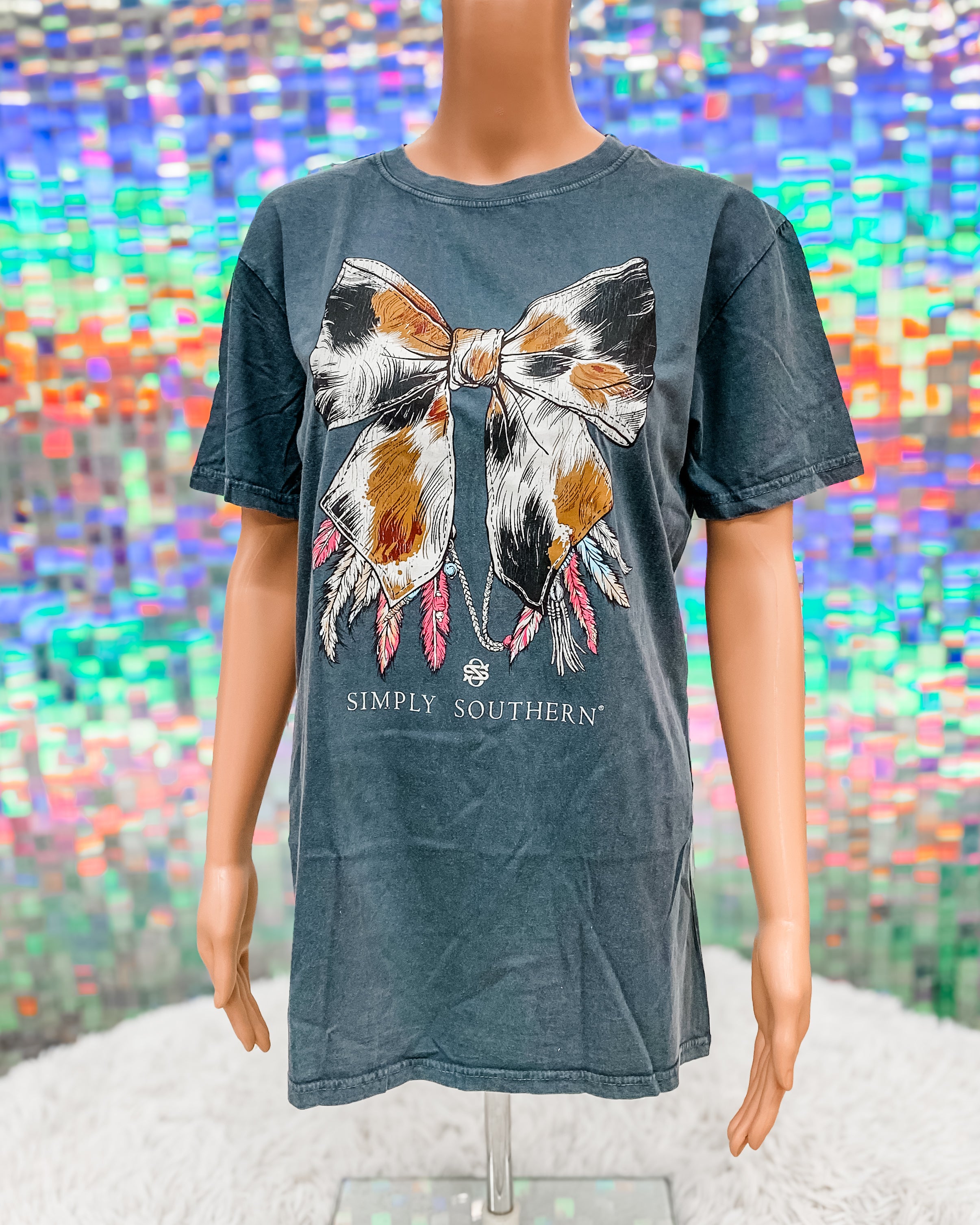 Add a touch of western glam to your wardrobe with the Simply Southern “Cowhide Bow” Tee! Featuring a chic cowhide-print bow accented with colorful feathers, this graphic tee blends rustic charm with feminine style. Soft, comfy, and effortlessly cute, it’s perfect for everyday wear, country concerts, or any day you want to show off your southern flair!