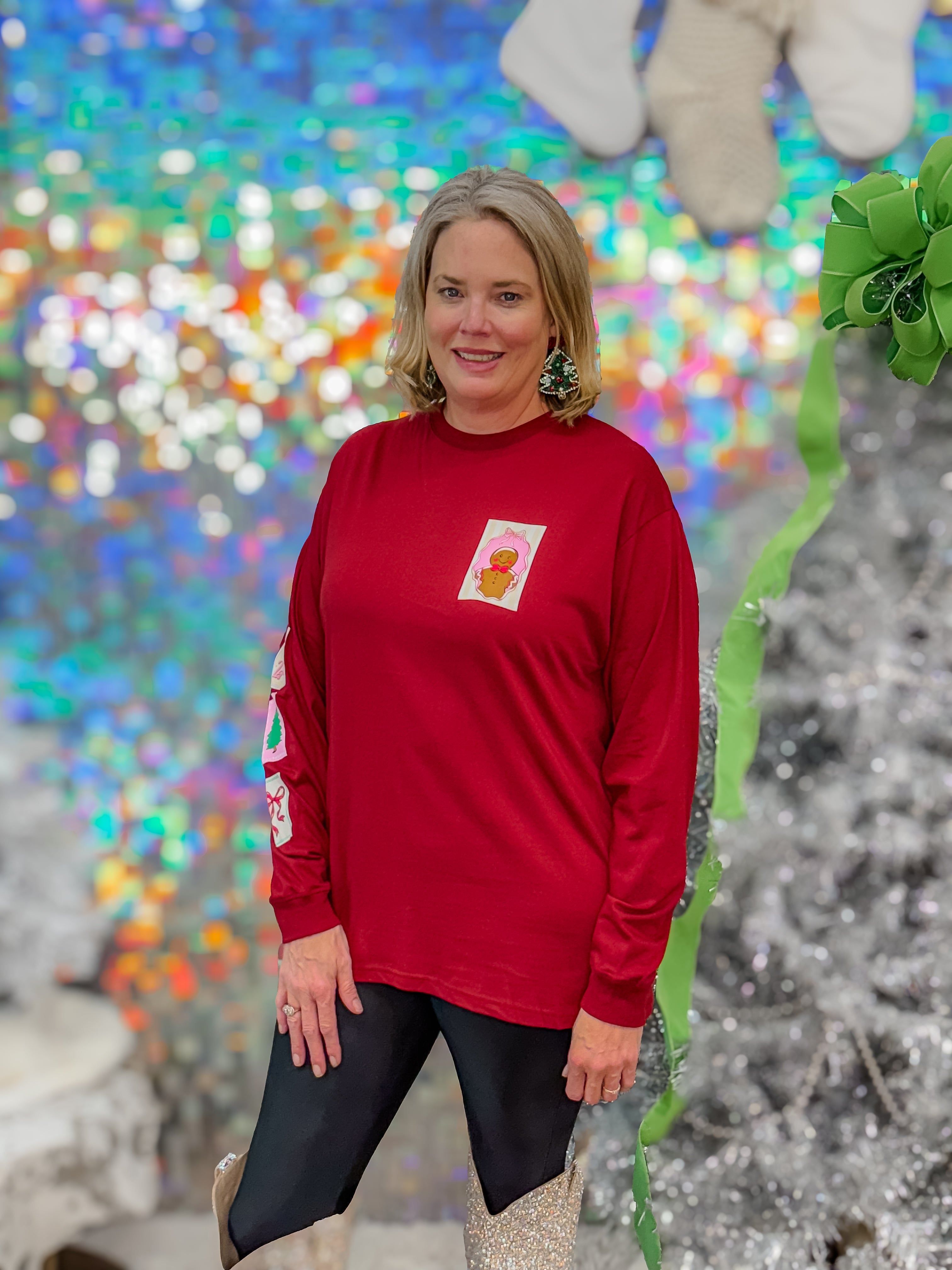Carmine LS shirt with the phrase ''tis the season' and a variety of holiday themed postage stamps. More stamps on left chest and along right sleeve.