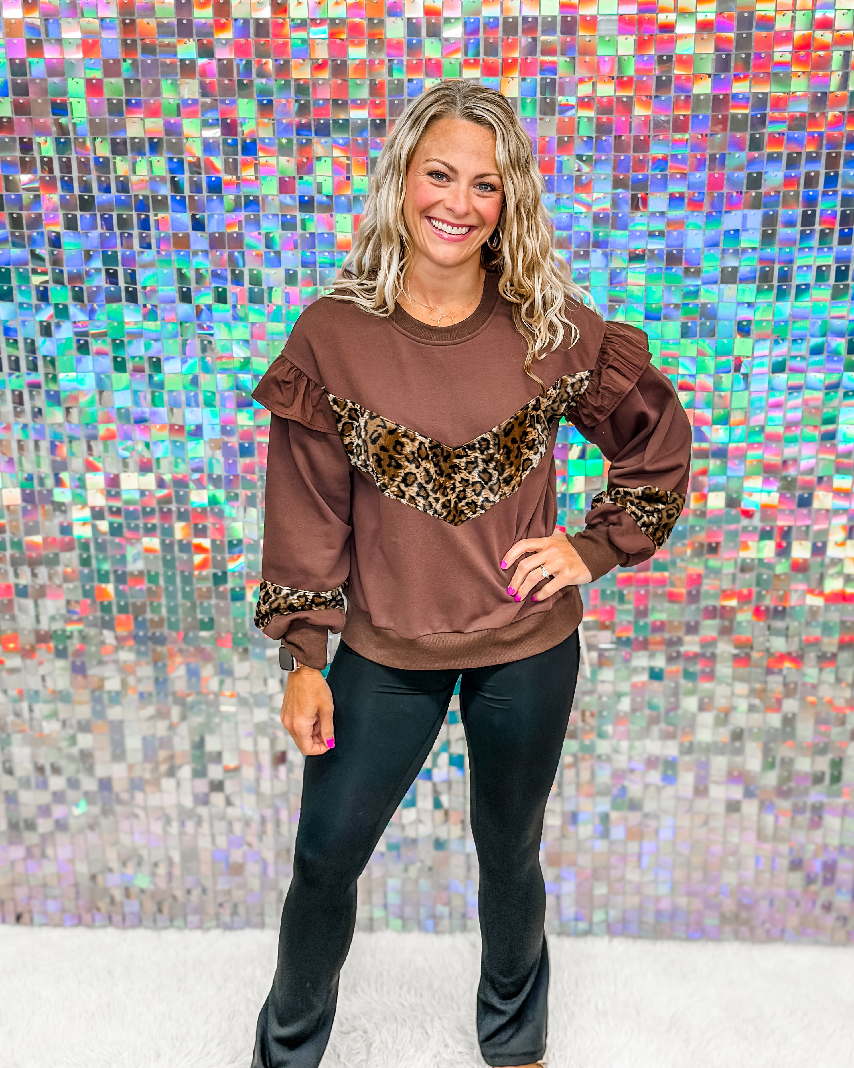 Channel your inner wild side with this fabulous cheetah print long sleeve top—a bold and beautiful piece with flirty ruffle details that add just the right touch of sass. Made from a lightweight, flowy fabric, it’s perfect for dressing up or down, and those ruffled accents at the shoulders and cuffs?