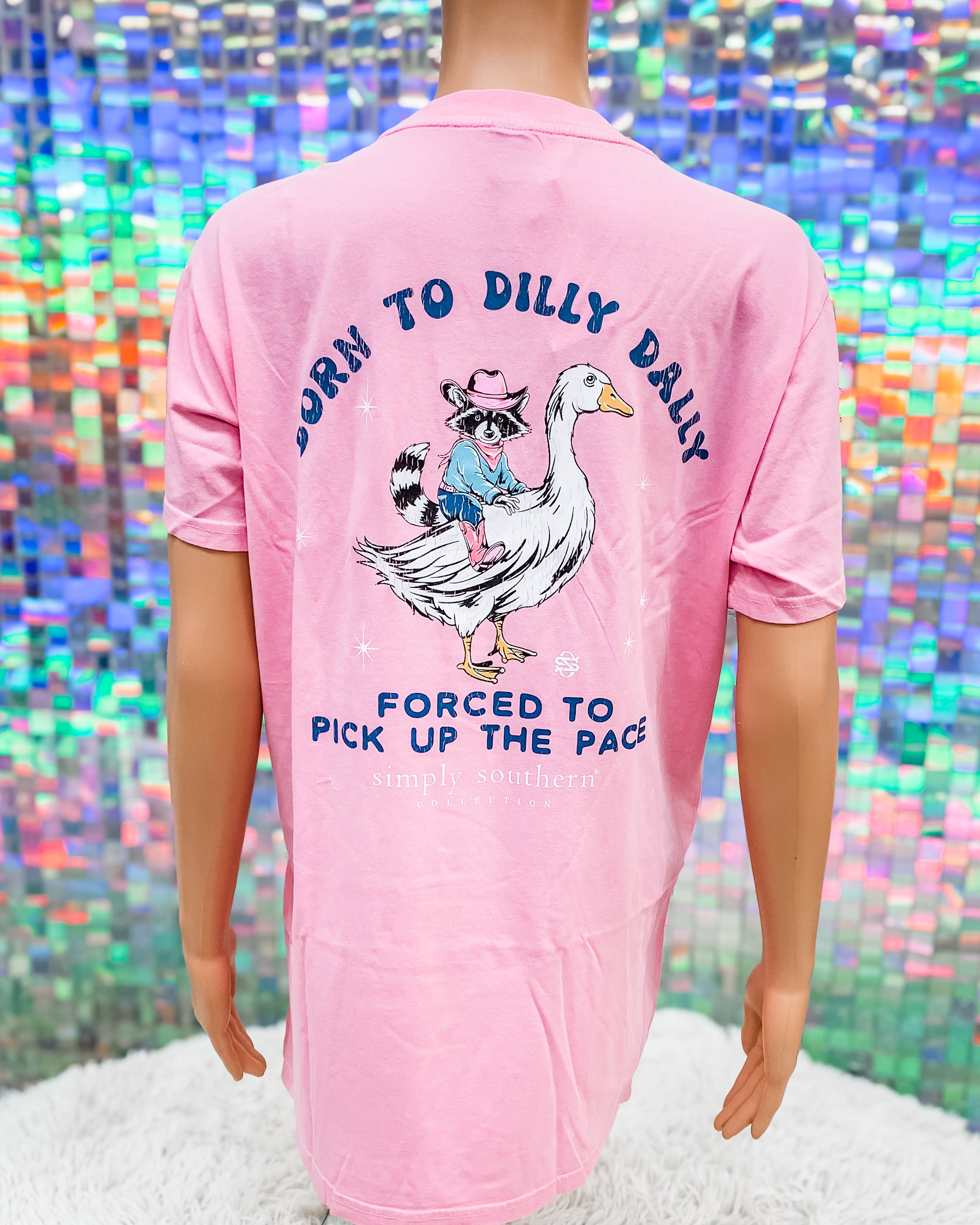 Show off your fun and sassy side with the Simply Southern “Born to Dilly Dally” Tee! Featuring an adorable raccoon in a pink cowboy hat riding a duck, this playful graphic is paired with the phrase “Born to Dilly Dally, Forced to Pick Up the Pace.” Soft, comfy, and full of personality, this tee is perfect for casual days, running errands, or just living life at your own pace – Southern style!