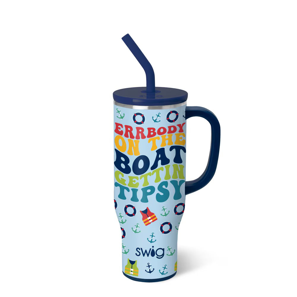 Mega sips, mega chill! 🧊 Errbody this summer is getting tipsy with Swig! 🍹 This drinking buddy design comes party ready with life jackets, anchors, and buoys on a pale glitter blue background.