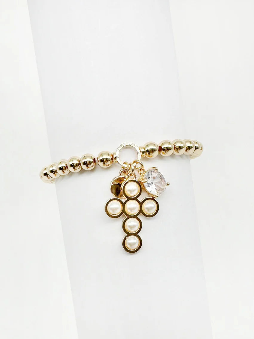 Delicate meets divine in our Faith & Pearls Bracelet, a stunning gold beaded stretch piece adorned with a pearl-accented cross charm. This timeless design features glossy gold beads and dainty charms—including a crystal gem—for just the right amount of sparkle and grace.