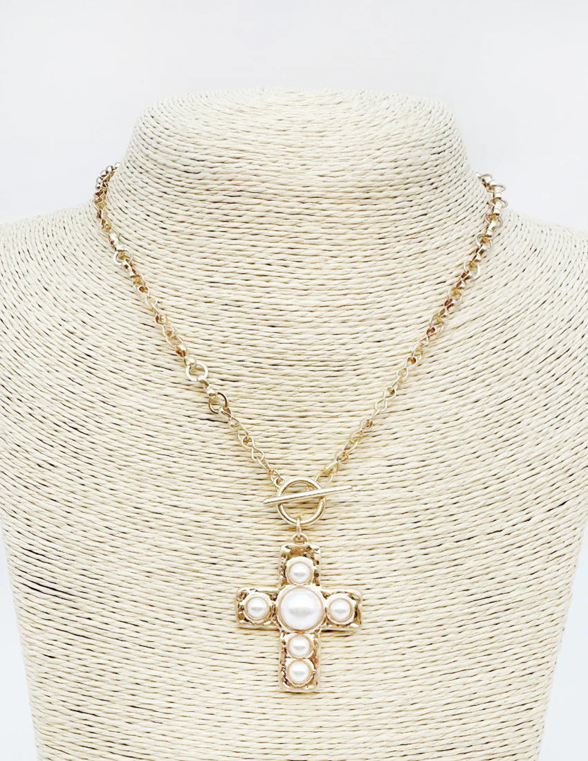 Let your faith shine in style with our Faithfully Chic Necklace. This statement piece features a bold gold toggle chain and a hammered cross pendant adorned with luminous faux pearls. The textured finish and center toggle closure add a modern twist to a timeless symbol of grace and strength.