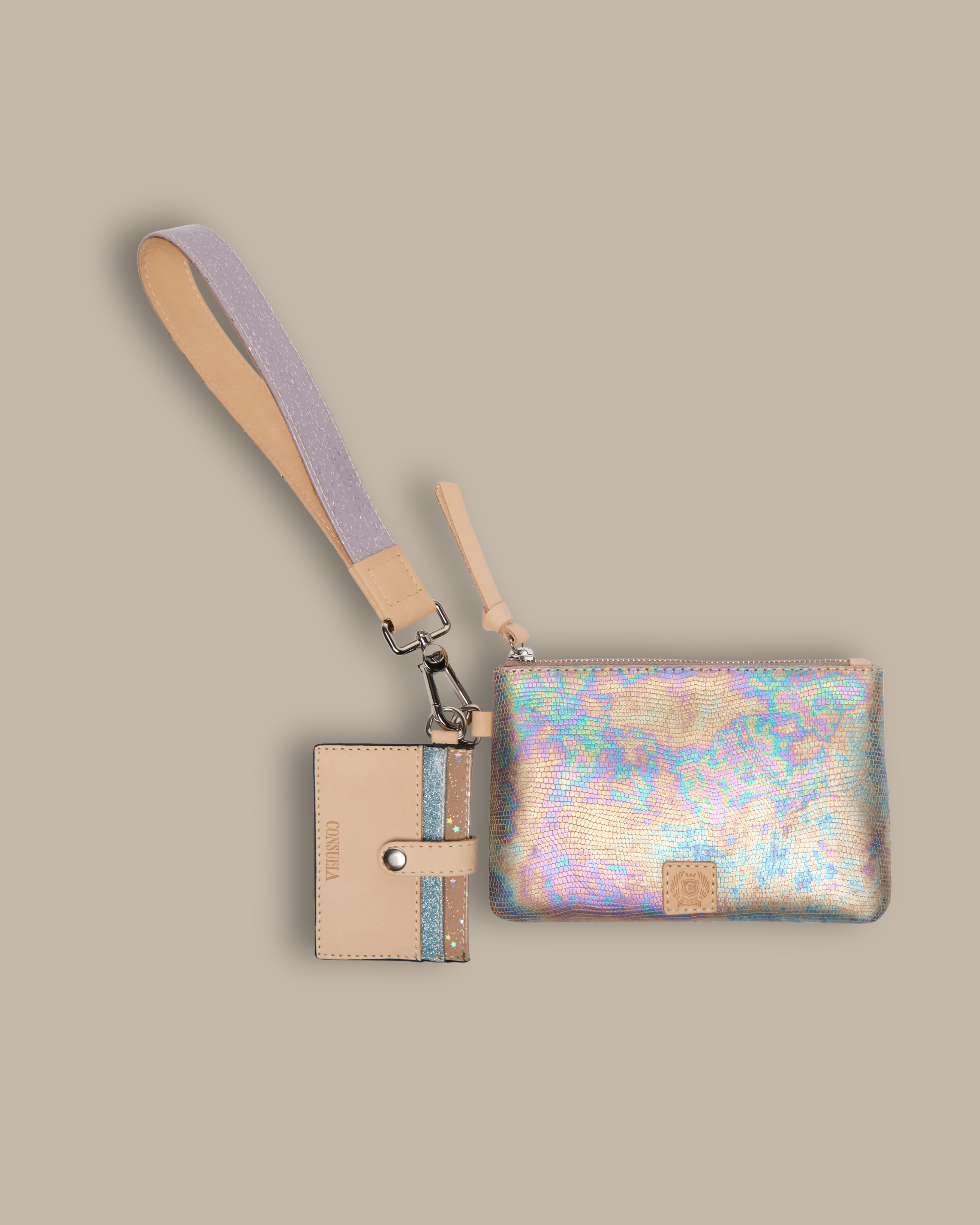 The Combi, a combination of on-the-go accessories, is a new way to carry your keys, cards, and the small stuff together or separately. This leather wristlet wallet includes a pocket pouch, secure card slot wallet and fits comfortably around your wrist - ready for your next journey.