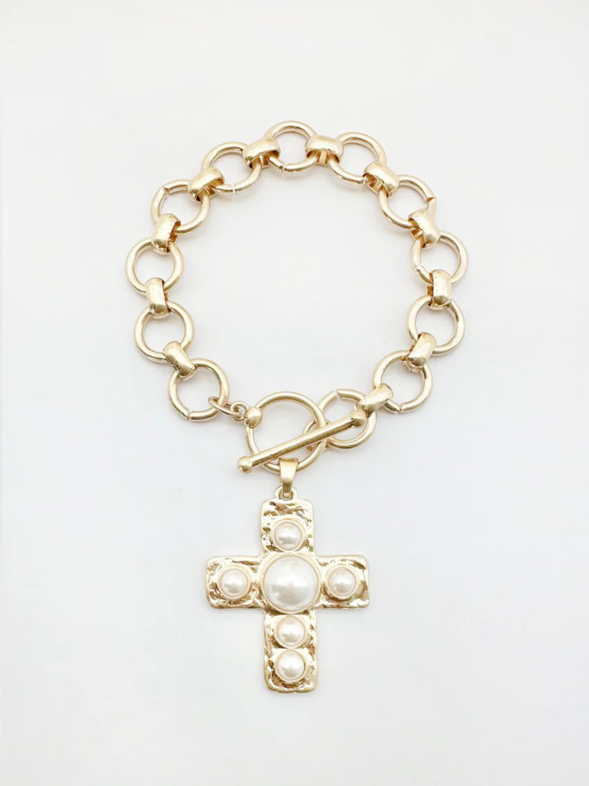Make a statement of faith and fashion with our Grace & Glory Bracelet—a bold, gold-tone chain link bracelet featuring a stunning pearl-accented hammered cross pendant. The toggle clasp adds a vintage touch, while the oversized pearls bring elegance and meaning to this timeless piece.