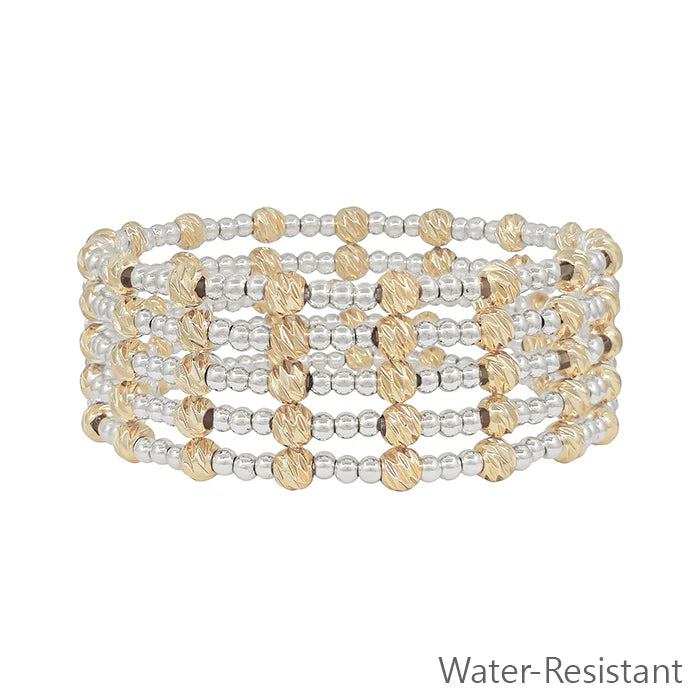 Shimmer with subtle edge in our Silver Siren Bracelet—a stretch-fit beauty made from multi-sized metallic beads with textured accents that catch the light just right. This single-layer statement piece gives you the stacked look without the stack!